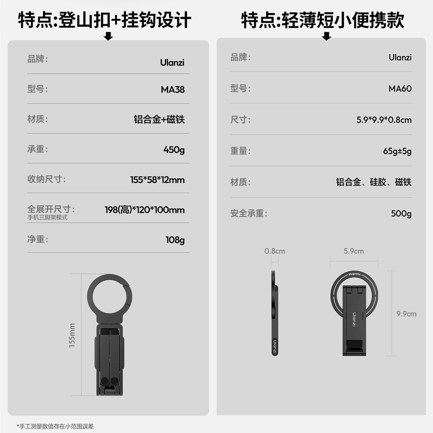 Ulanzi优篮子MA60手机磁吸摄影支架三脚架MA38金属登山扣款二代MagLock便携式拍摄vlog旅行自拍轻便支架