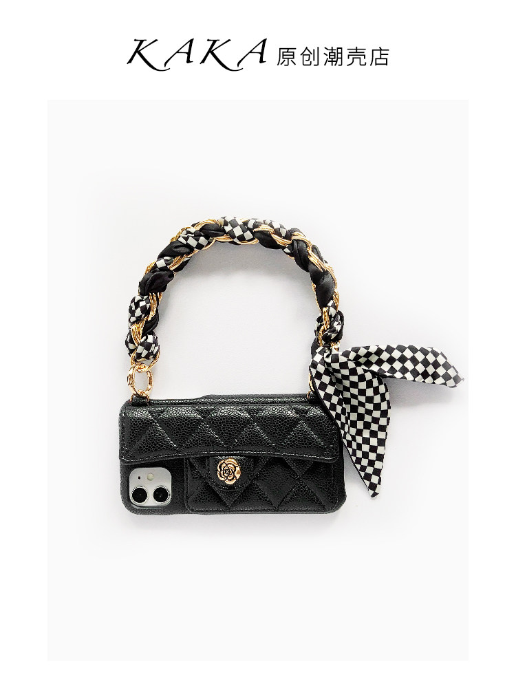 小众原创真皮手感黑白格丝巾手提手链苹果16promax包包手机壳适用于iPhone15/13/12/11小香零钱插卡包保护套