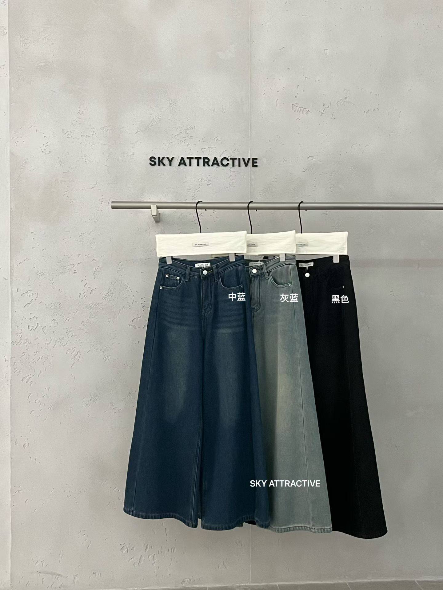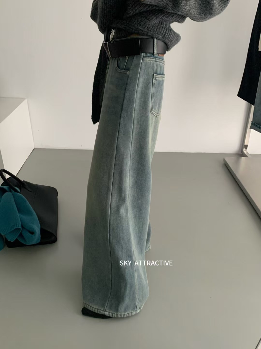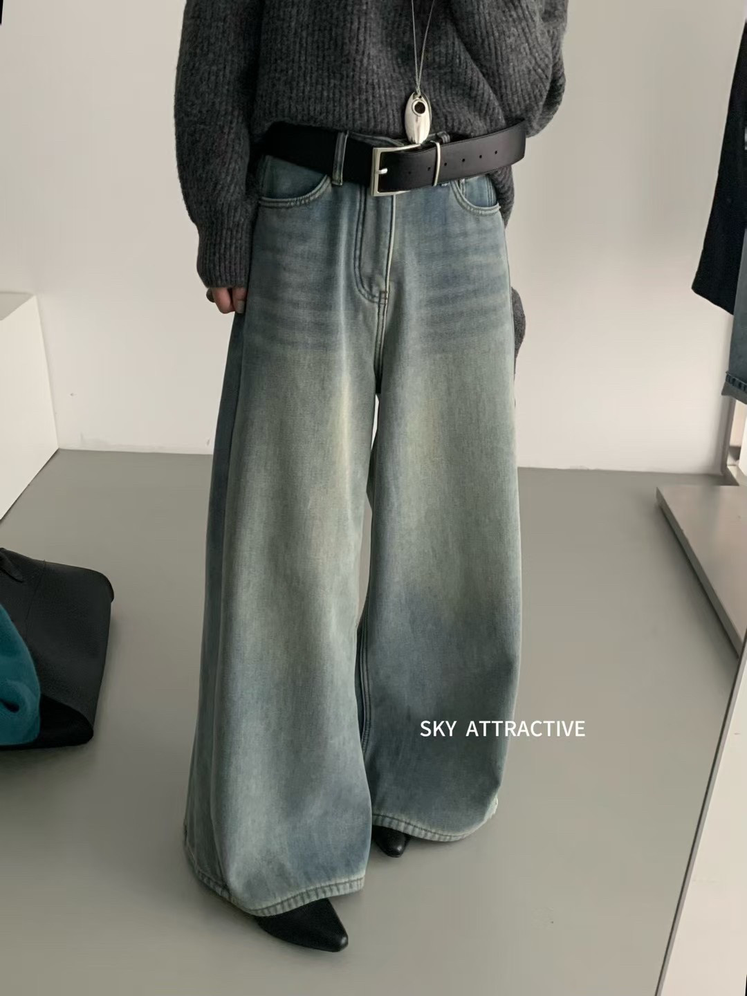 SKY复古高腰怀旧洗水牛仔加绒加厚阔腿裤气质显瘦直筒拖地长裤女