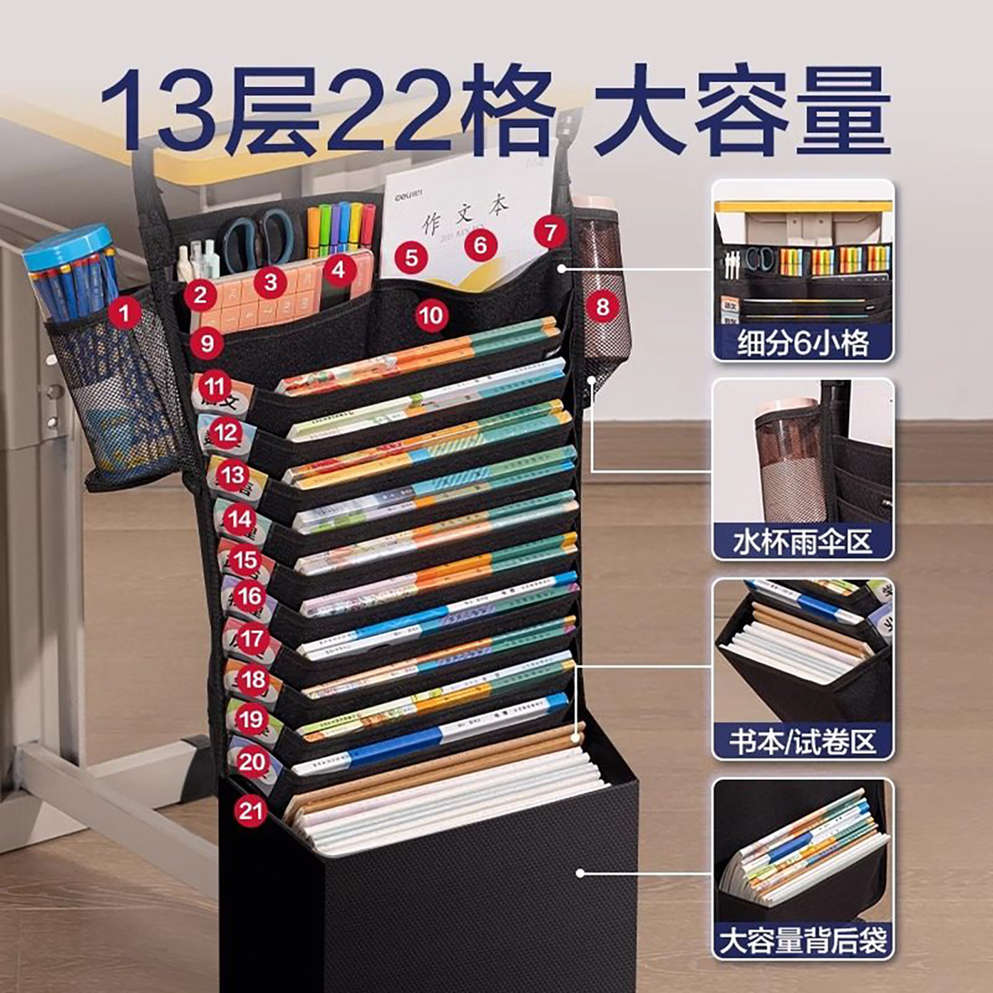 得力大容量加厚桌边挂书袋1200D高中生初中生书袋课桌收纳学生挂桌侧收纳袋书桌书袋挂袋课桌收纳袋开学文具
