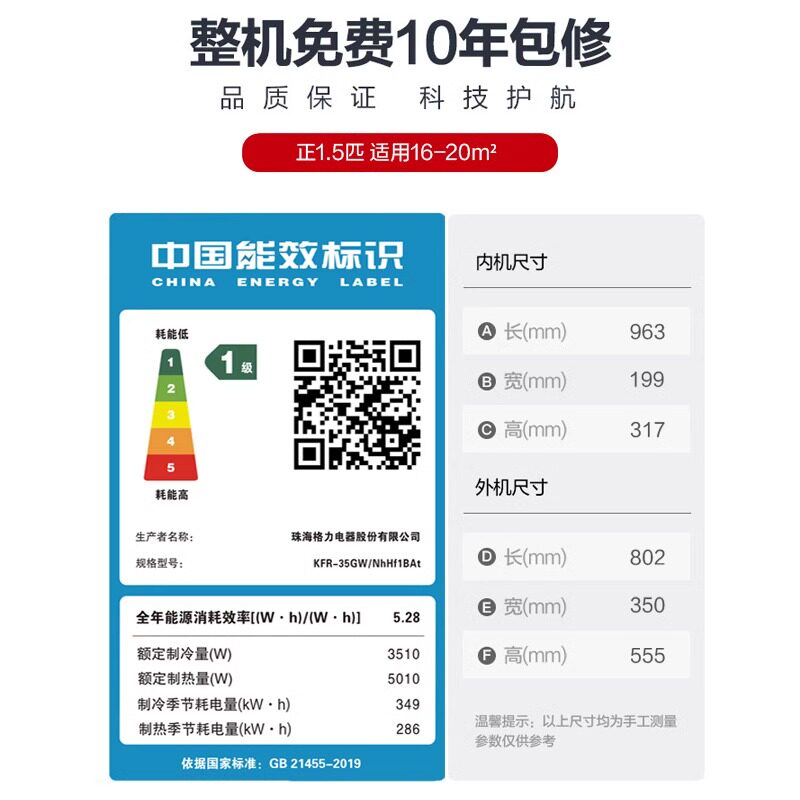 海尔净畅1.5匹空调家用挂式变频一级能效挂机冷暖两用卧室小型GCA