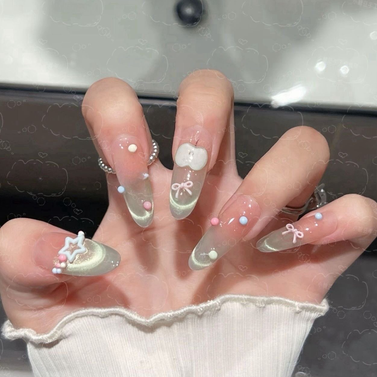 美甲2026新款穿戴甲显白裸色猫眼手工追光高级中长款椭圆法式杏仁