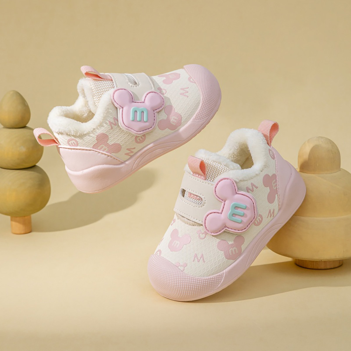 婧麒婴幼儿学步鞋秋冬季卡通米奇加绒保暖男女宝宝软底防滑机能鞋