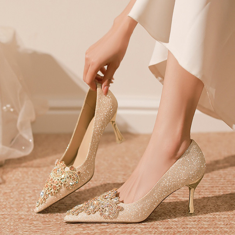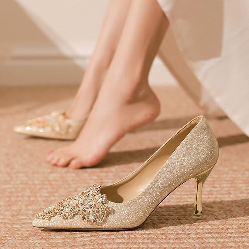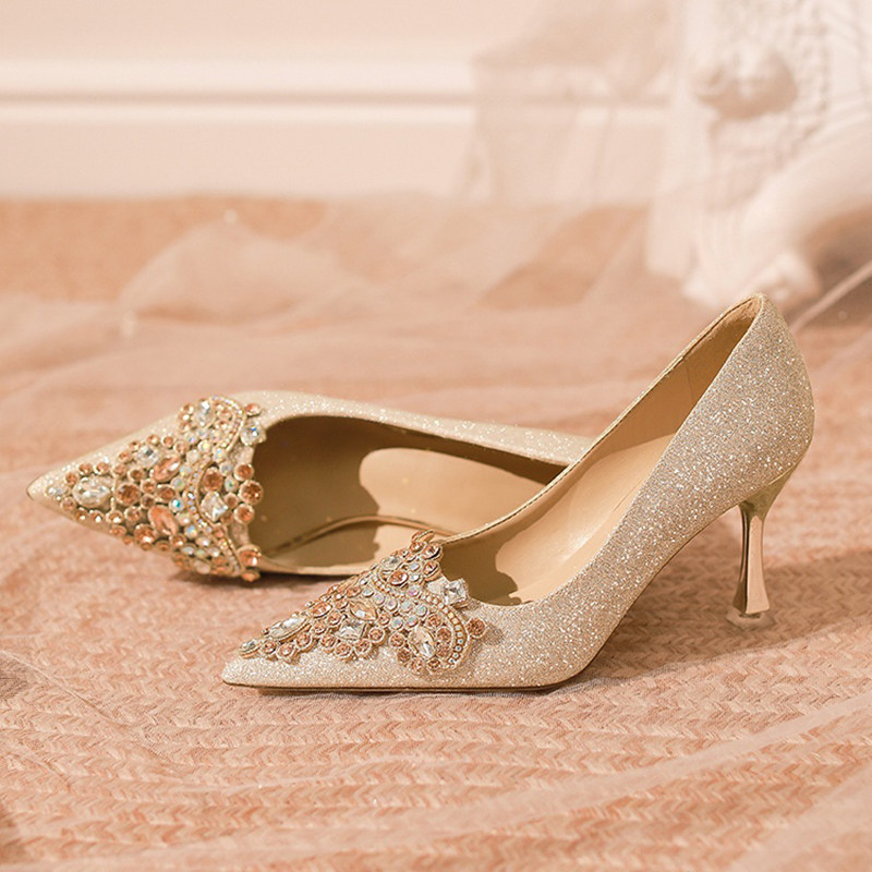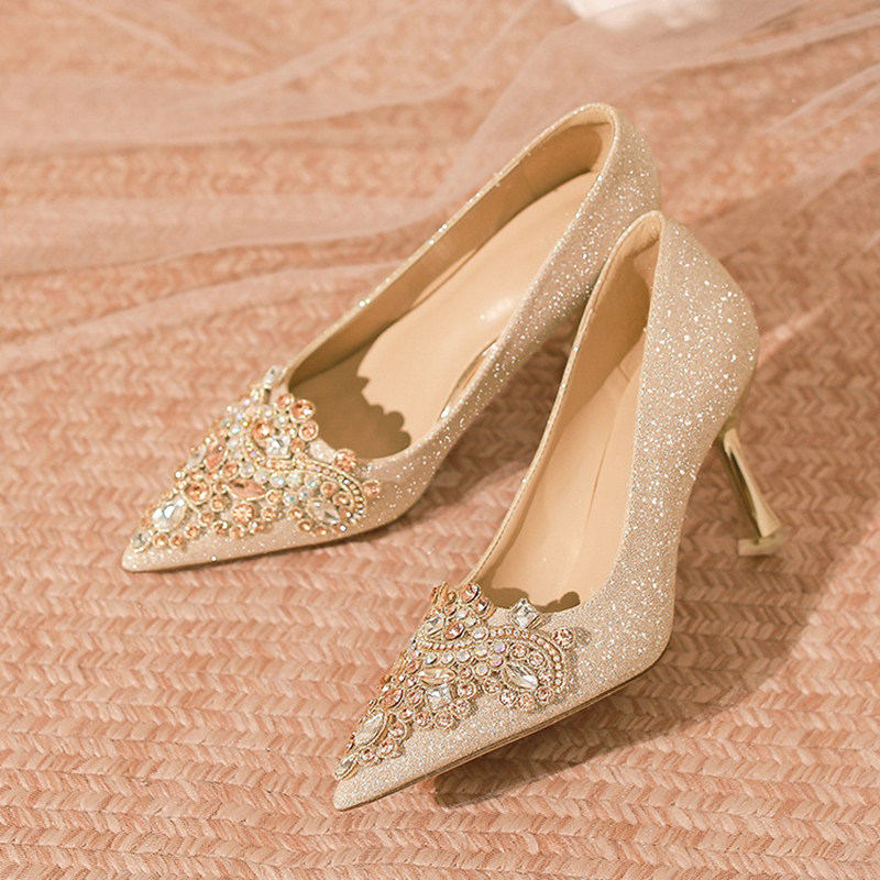 婚鞋女2024年新款主婚纱新娘鞋亮片香槟色水晶鞋尖头细跟高跟鞋女