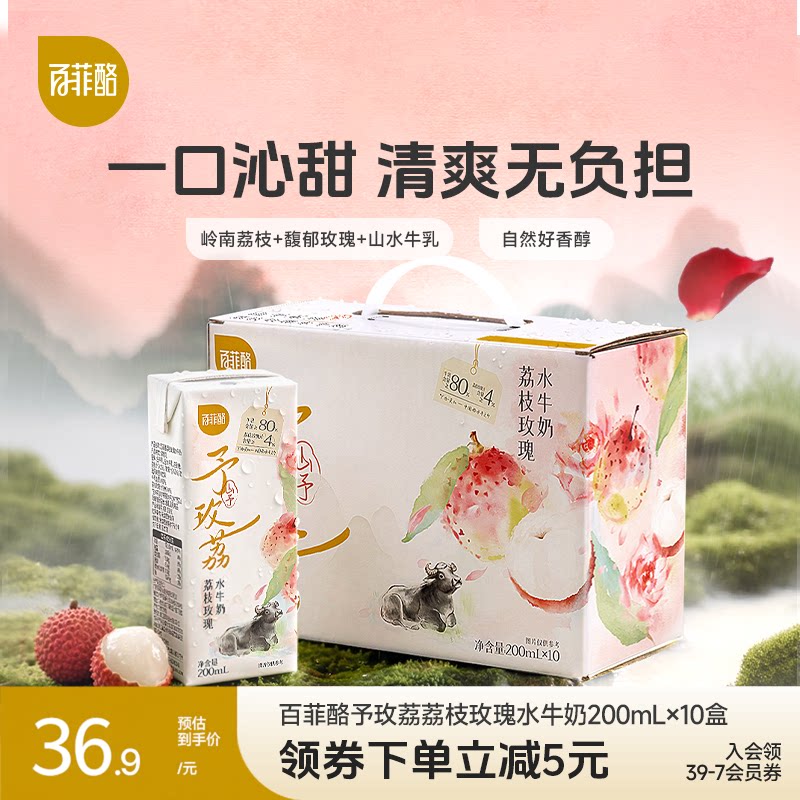 百菲酪山予系列荔枝玫瑰水牛奶200ml*10盒学生营养早餐牛奶风味乳