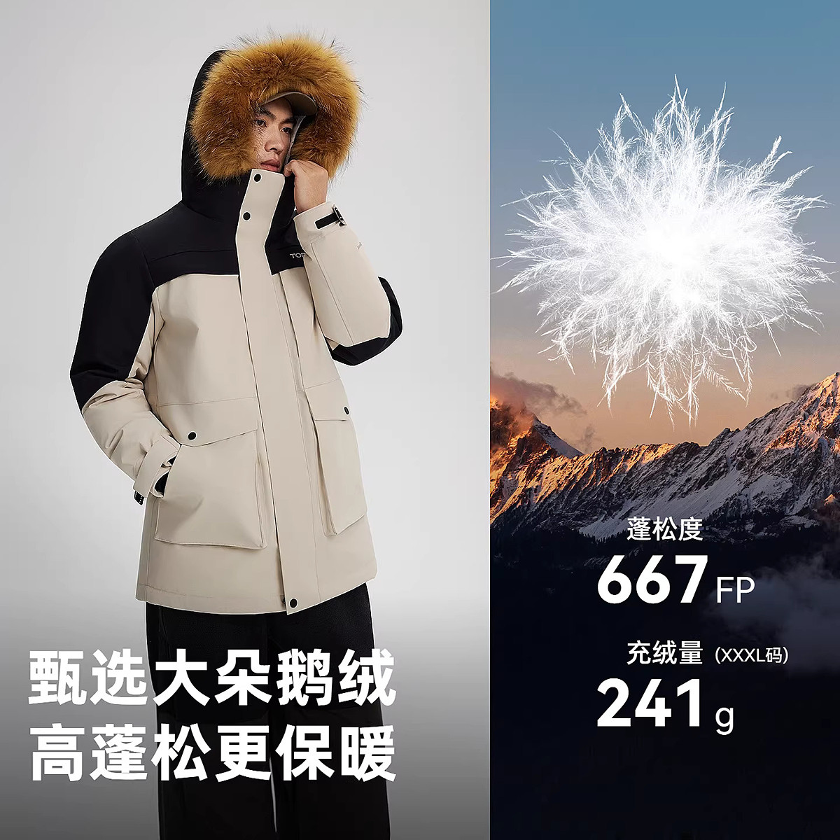 【鹅绒】探路者羽绒服男中长款大毛领保暖抗寒加厚工装派克服外套