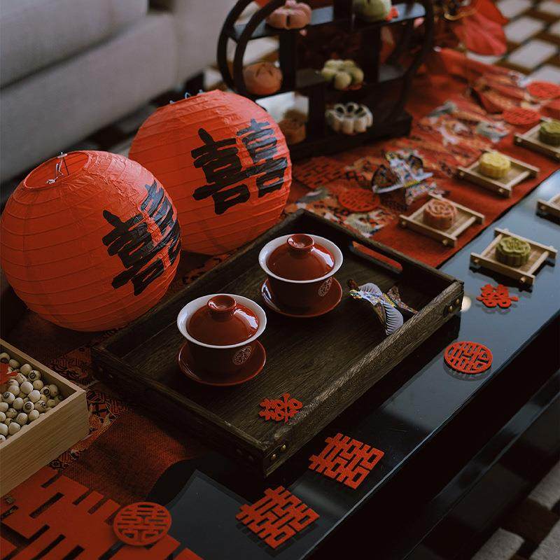 新中式客厅茶几结婚氛围感装饰桌布婚房布置摆台桌旗喜字敬茶杯子