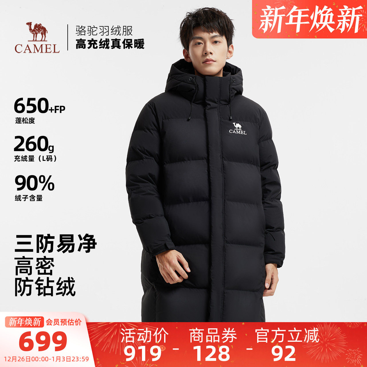 骆驼男装羽绒服男冬季三防中长款2025年新款黑色连帽外套户外新款