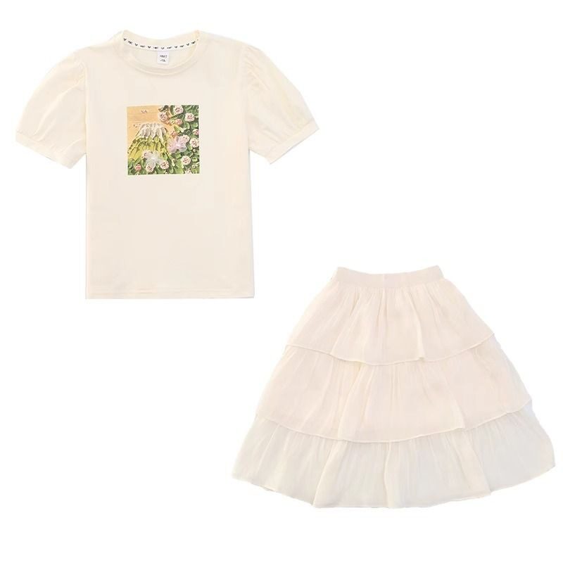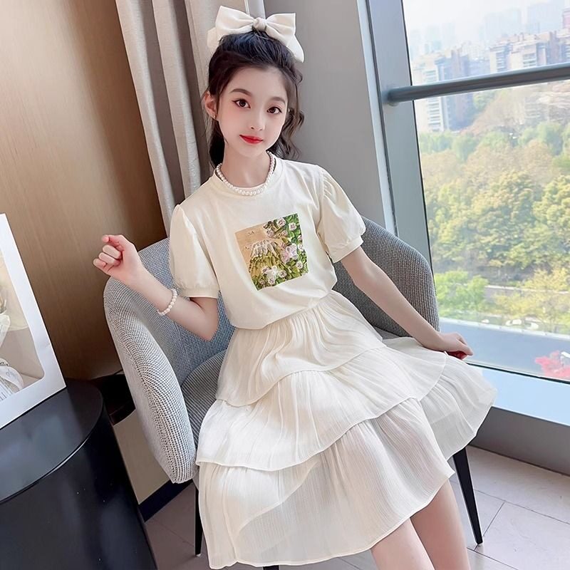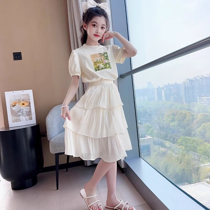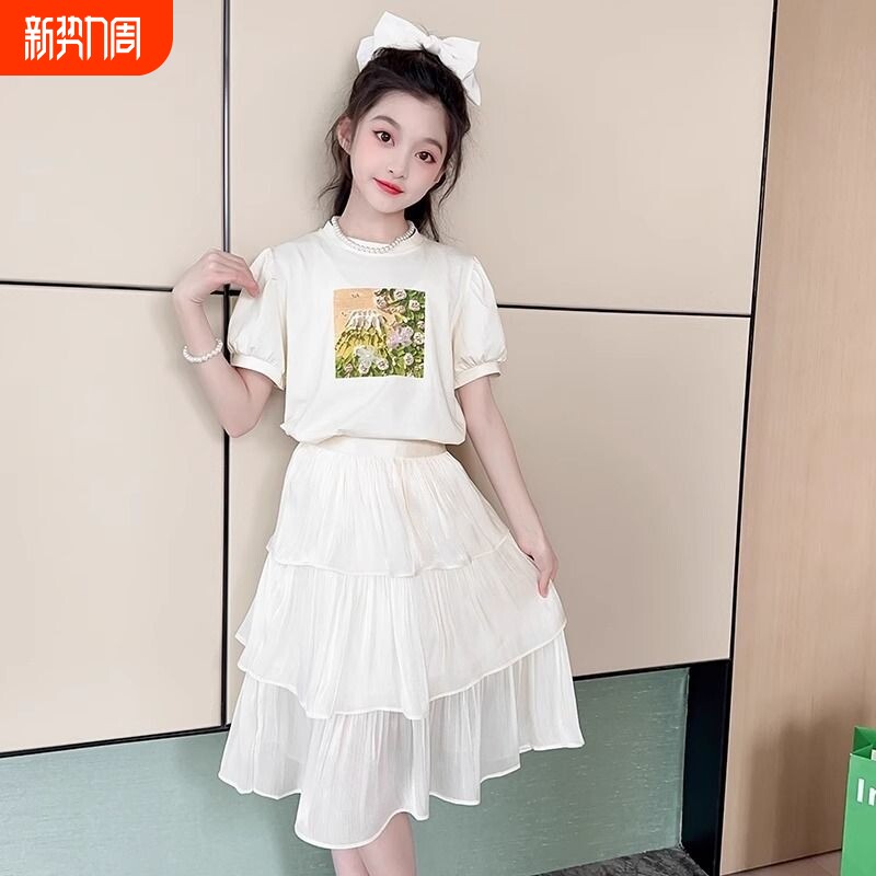 女童夏季套装2026新款夏装女孩纯色短袖Tt恤儿童半身蛋糕裙子套裙