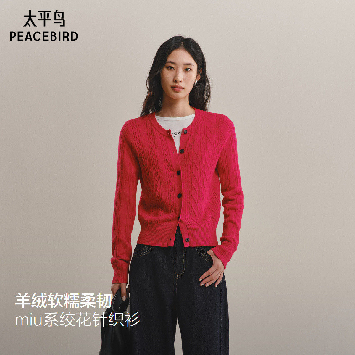 太平鸟 miu绞花圆领针织衫羊毛混纺女士品质通勤毛衣慵懒开衫红色