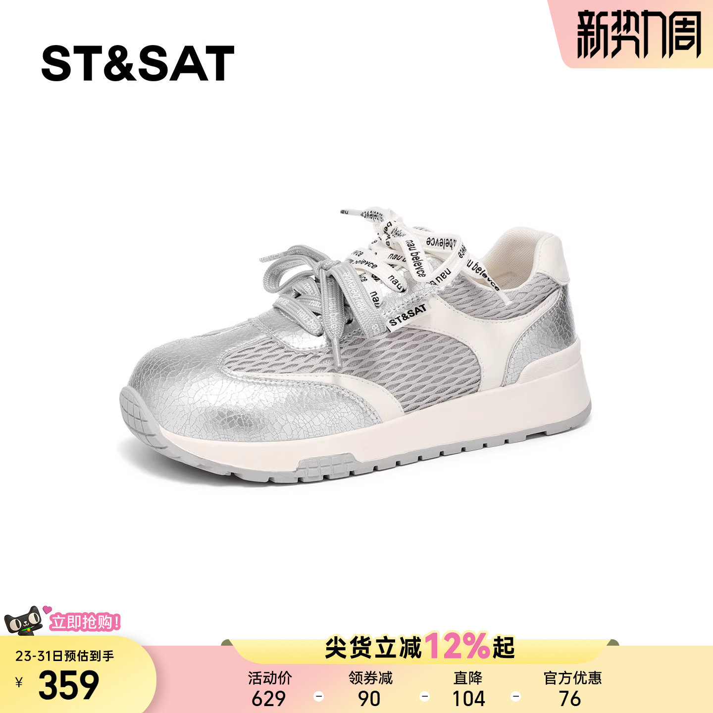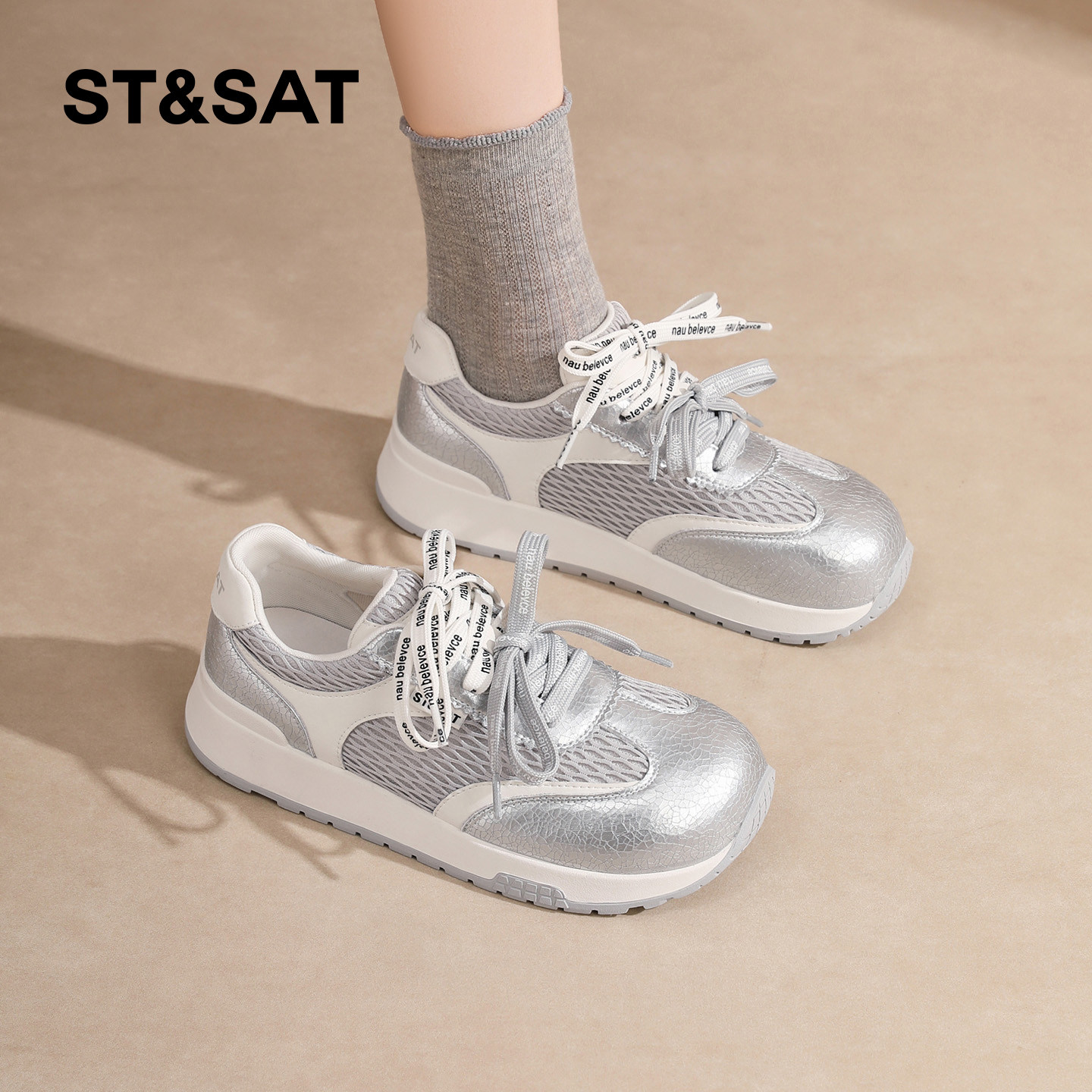 星期六银色双鞋带德训鞋女2026春季新款网面透气复古风运动休闲鞋