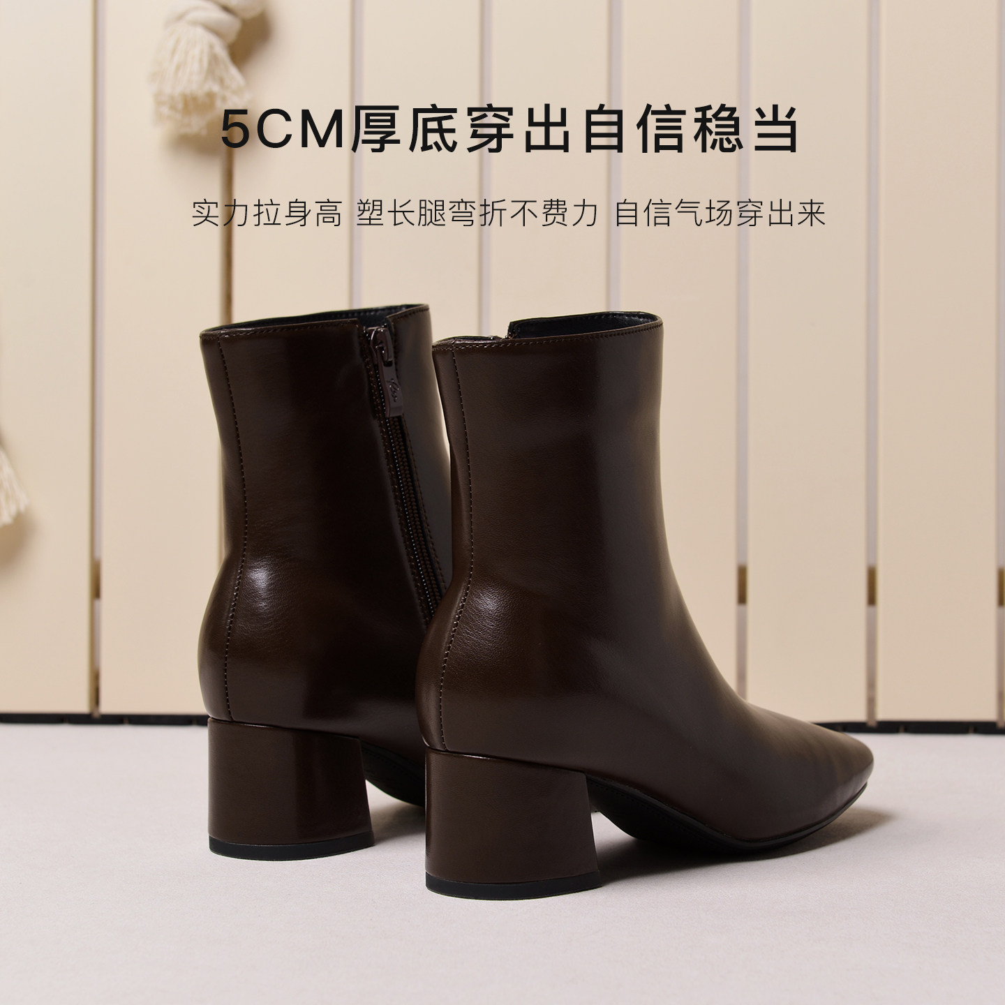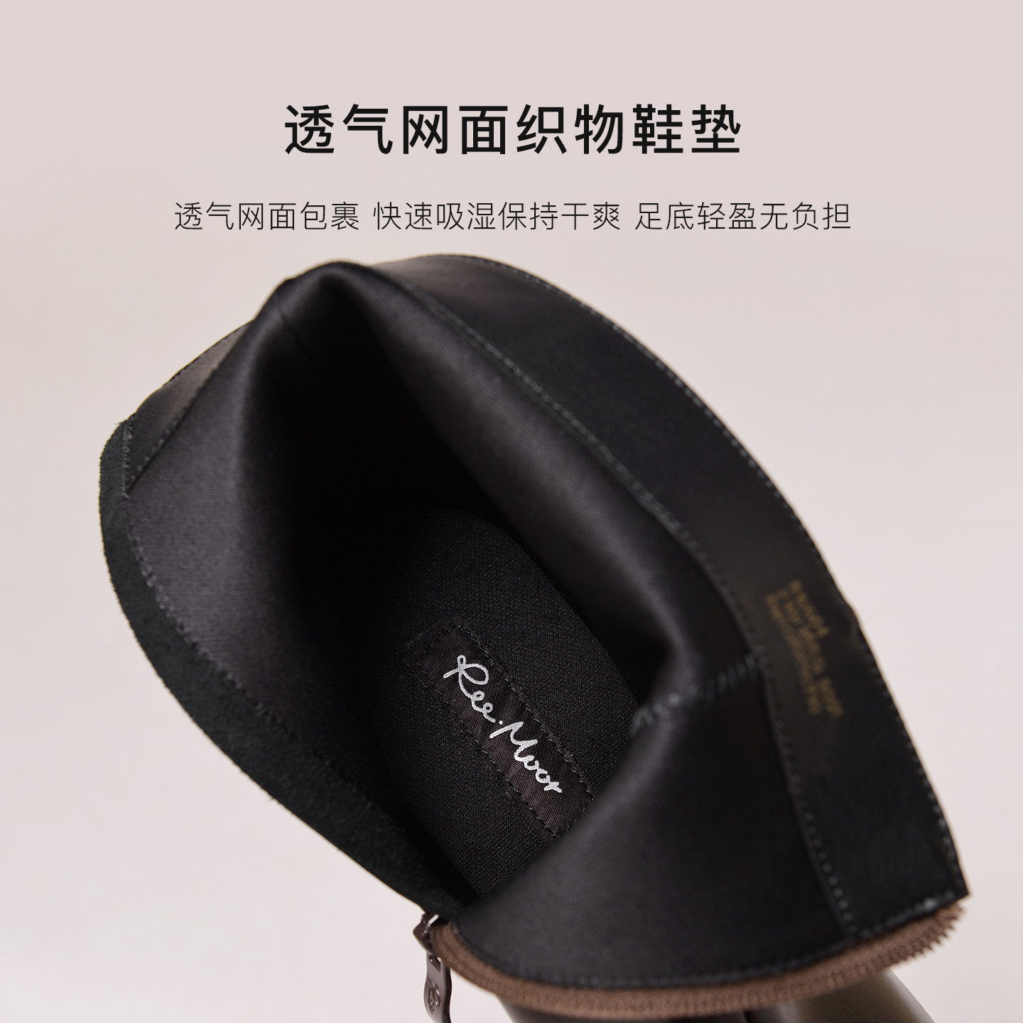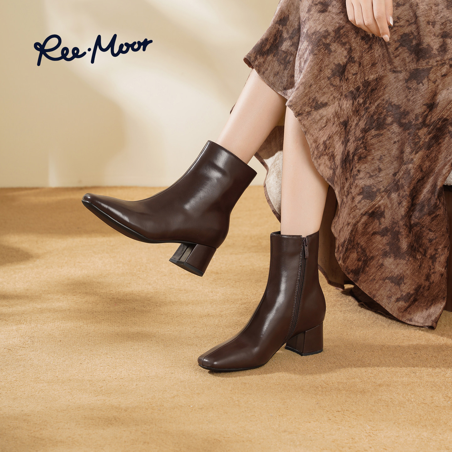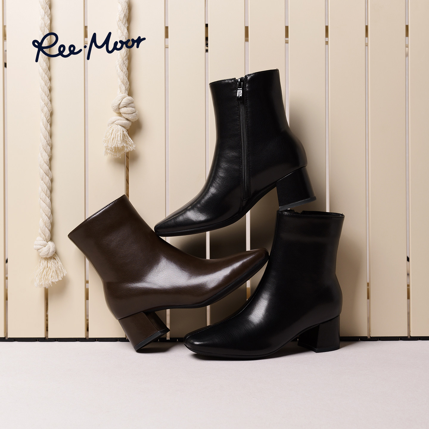 REEMOOR睿慕2025秋季新款英伦风方头粗跟增高短靴女侧拉链瘦瘦靴