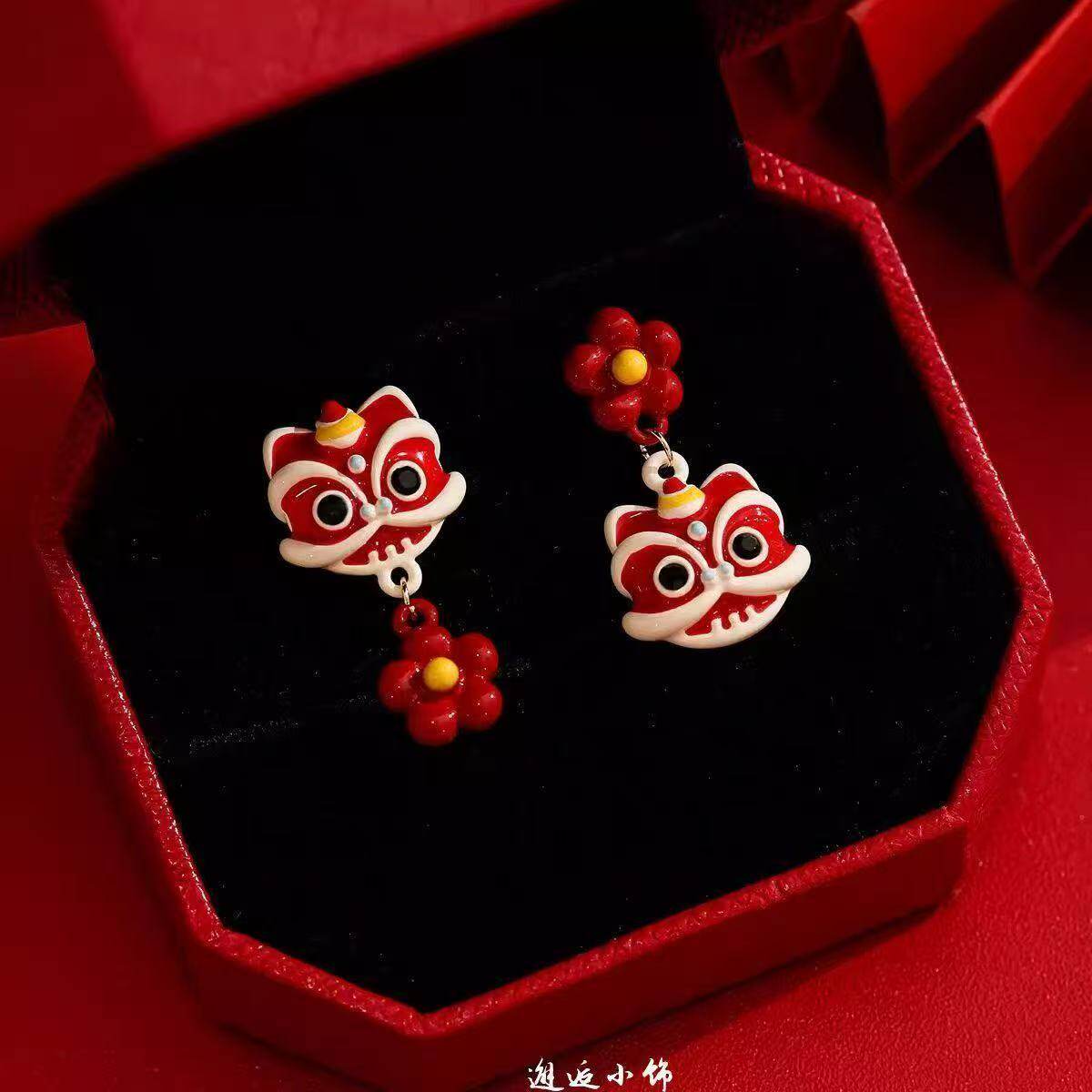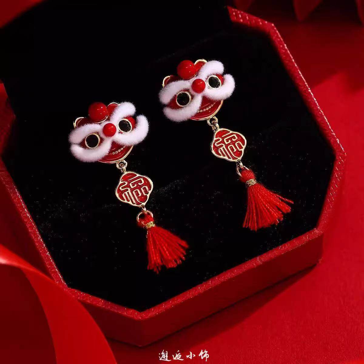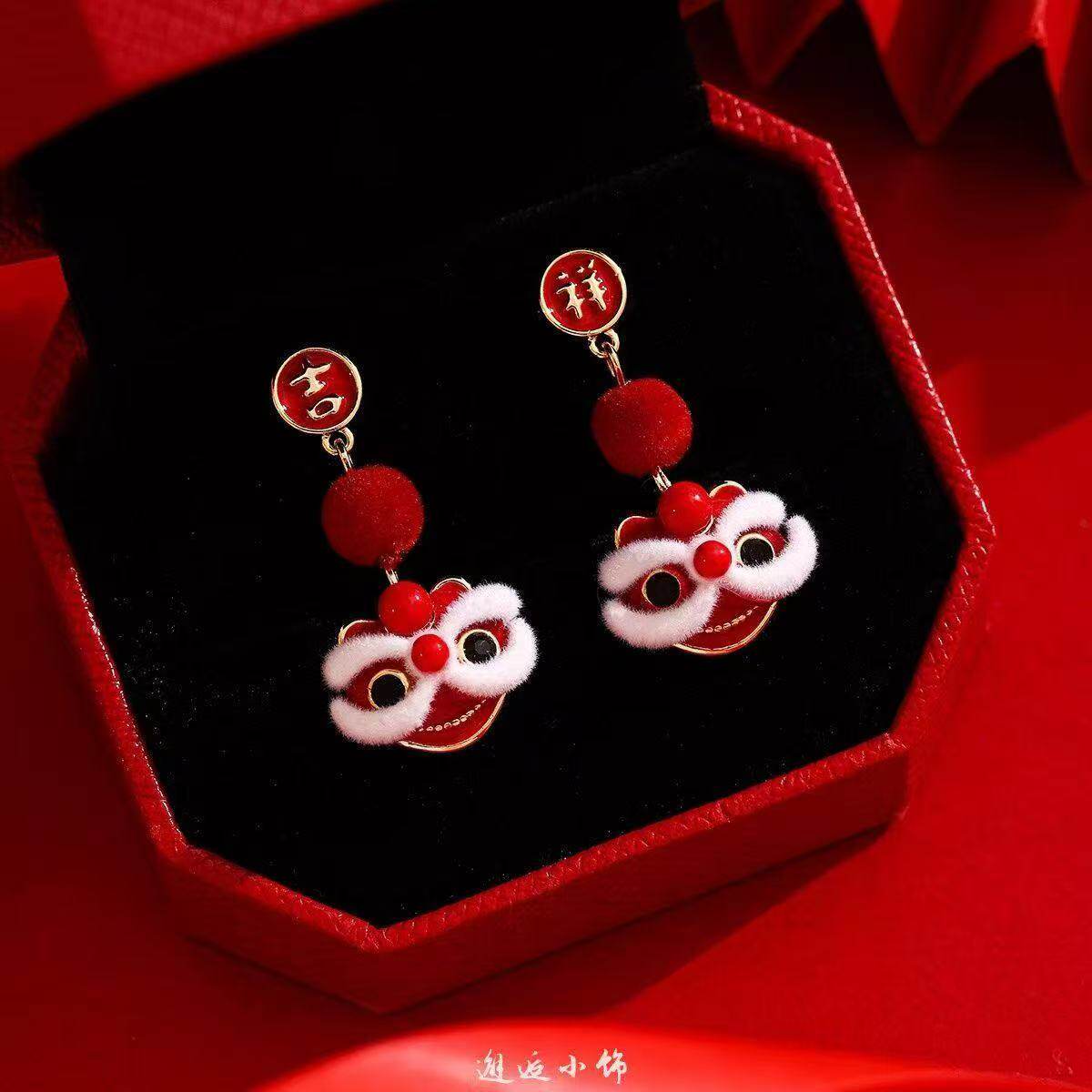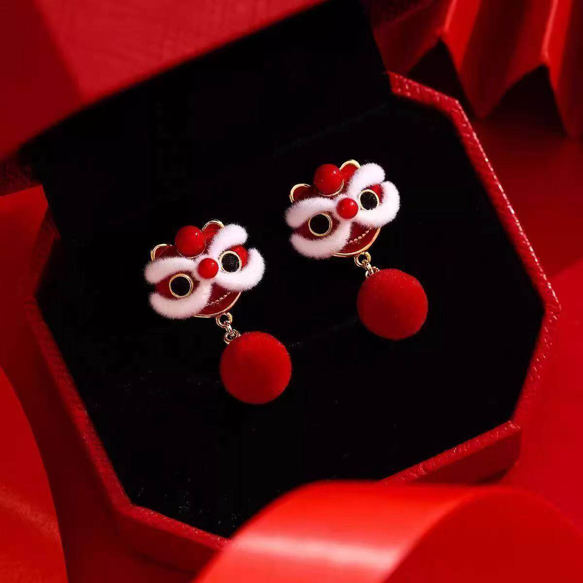 适合过年戴的耳环红色醒狮耳钉新中式国风耳饰新年丝绒耳坠女喜庆