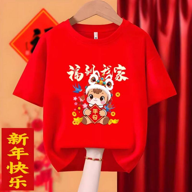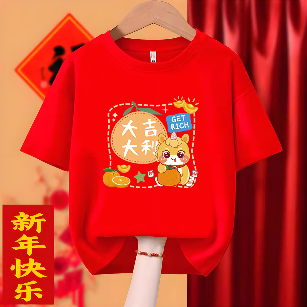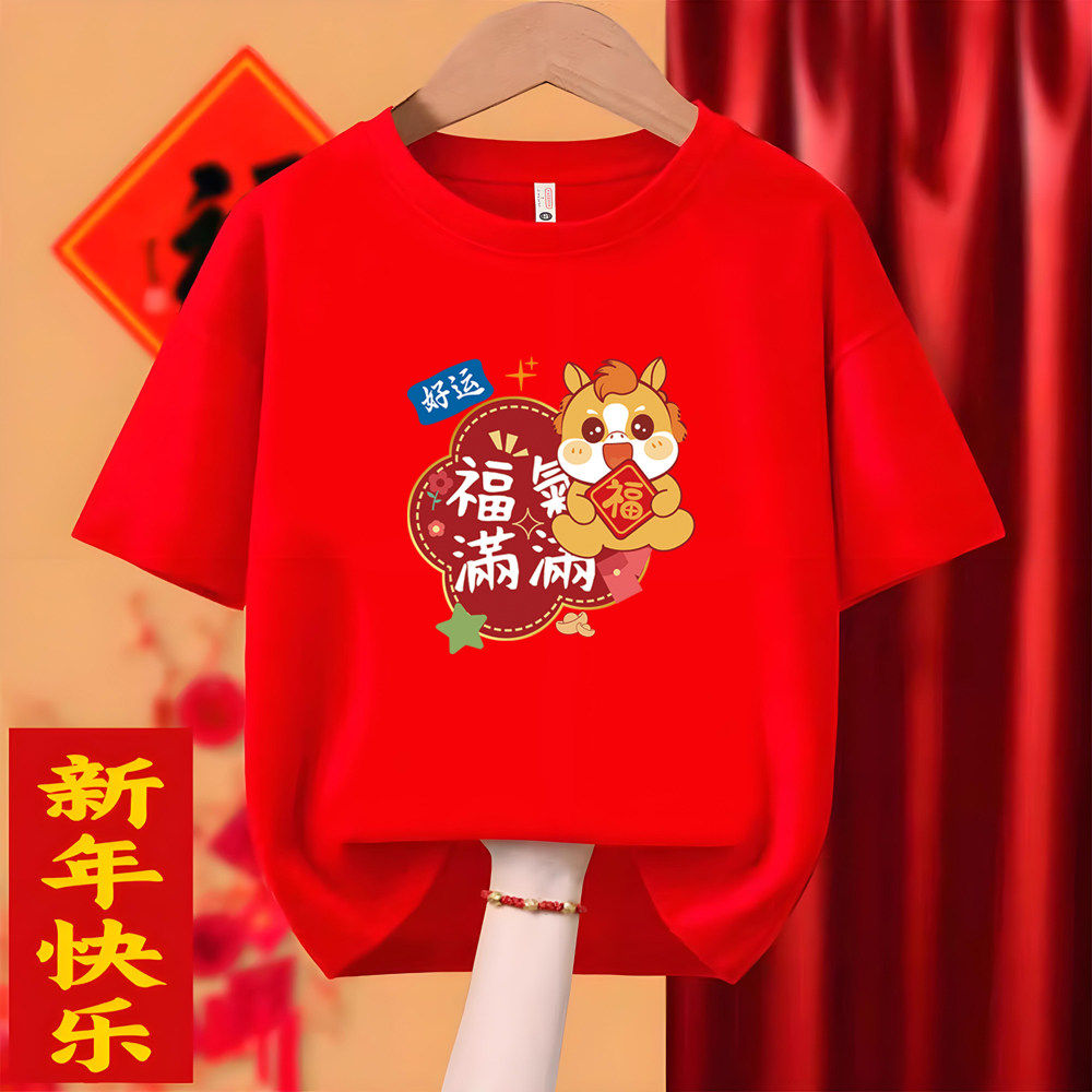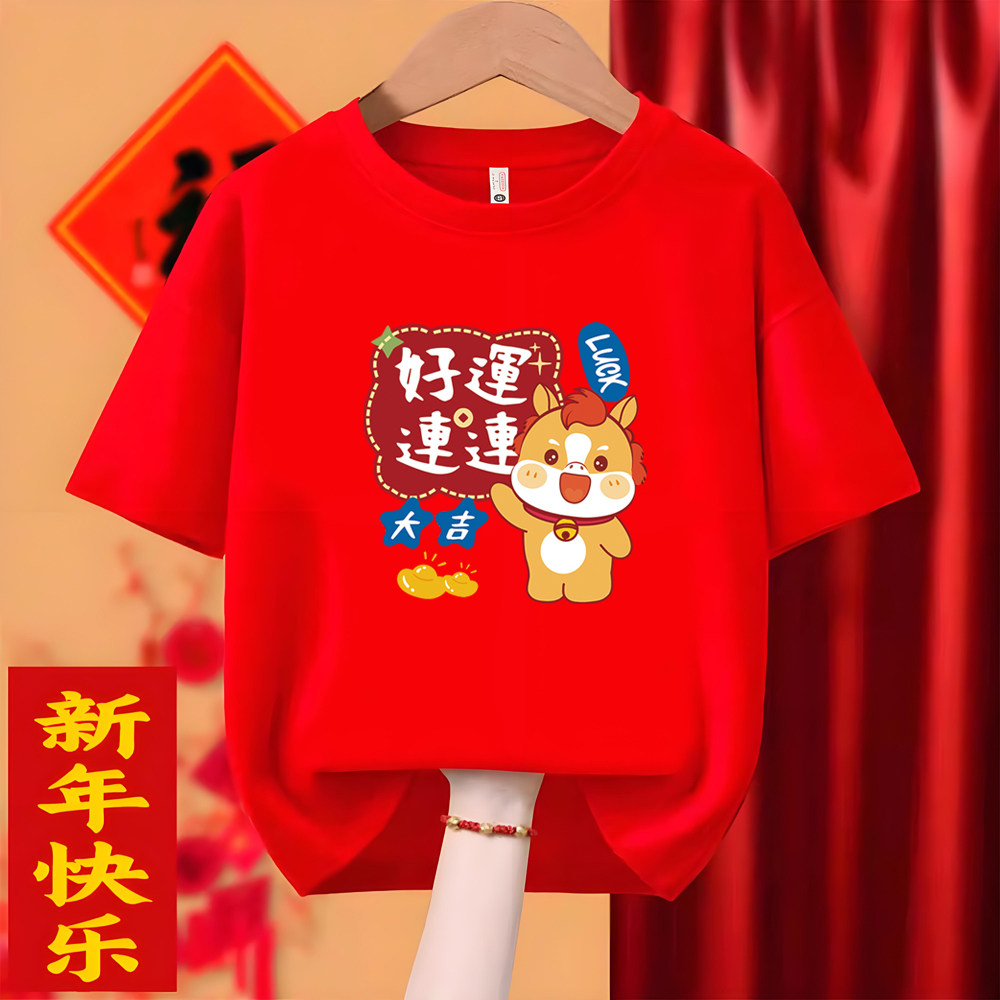 2026马年短袖T恤新年大吉红色本命年衣服纯棉亲子装过年全家福