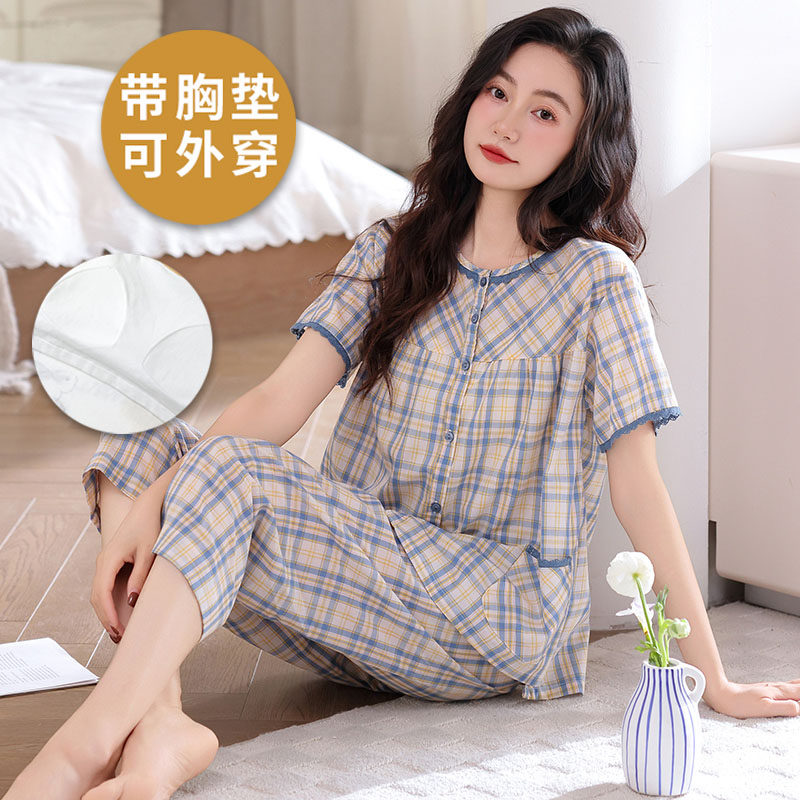 浪莎纯棉带胸垫睡衣女夏季短袖七分裤可外穿薄款韩式家居服两件套
