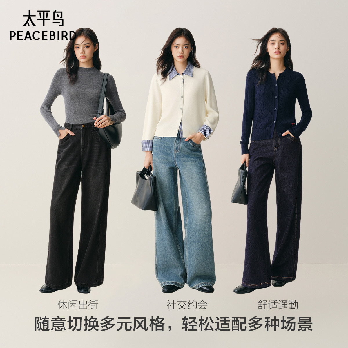 广角裤 太平鸟大直筒牛仔裤2025年秋冬新款宽松加绒阔腿牛仔裤女