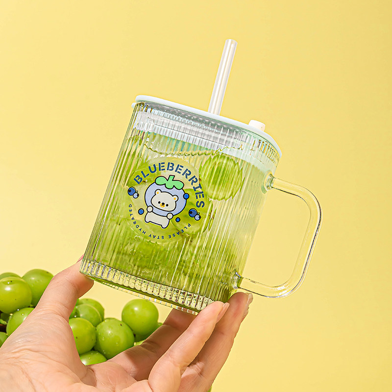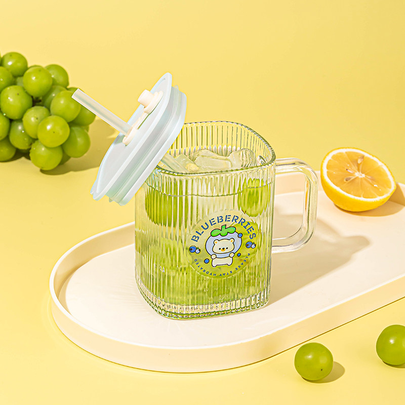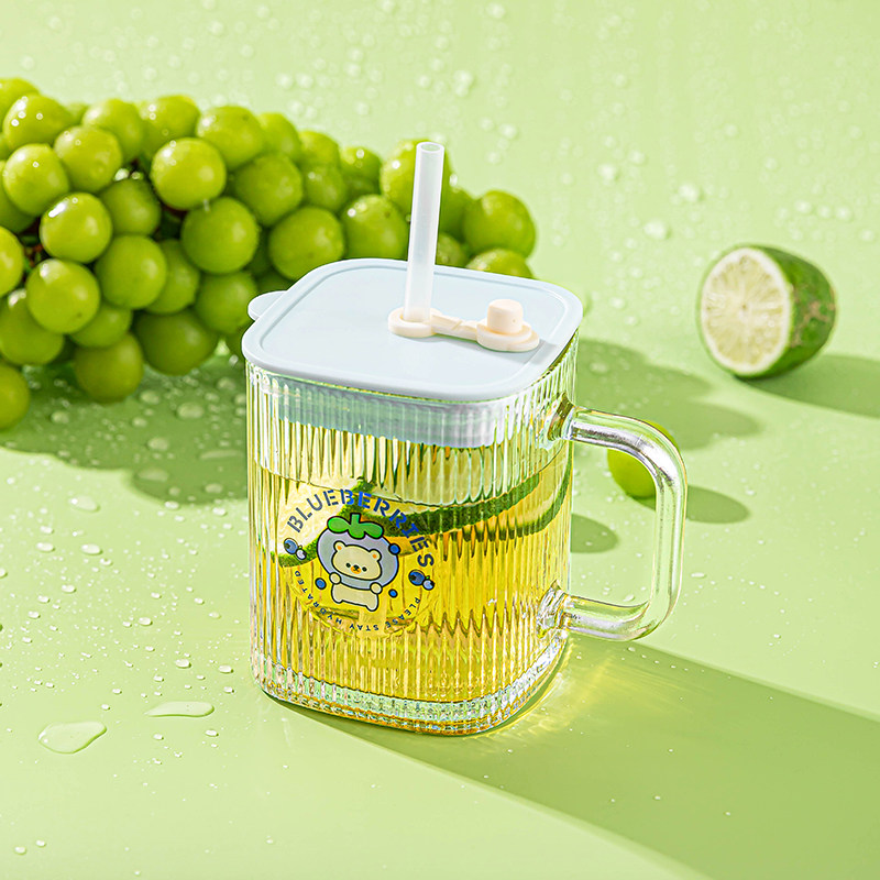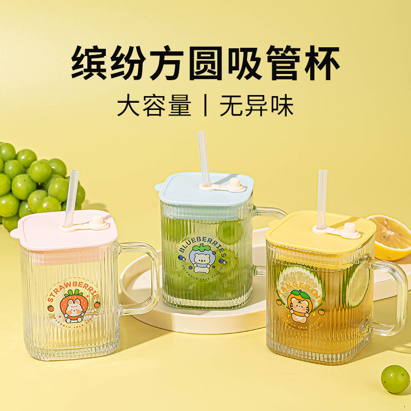 乐唯诗方形玻璃吸管杯高颜值带把手家用吸管水杯儿童高颜值卡通