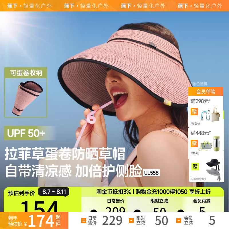 蕉下蛋卷草帽黑胶防晒UL558大檐沙滩海边法式防紫外线空顶防晒帽