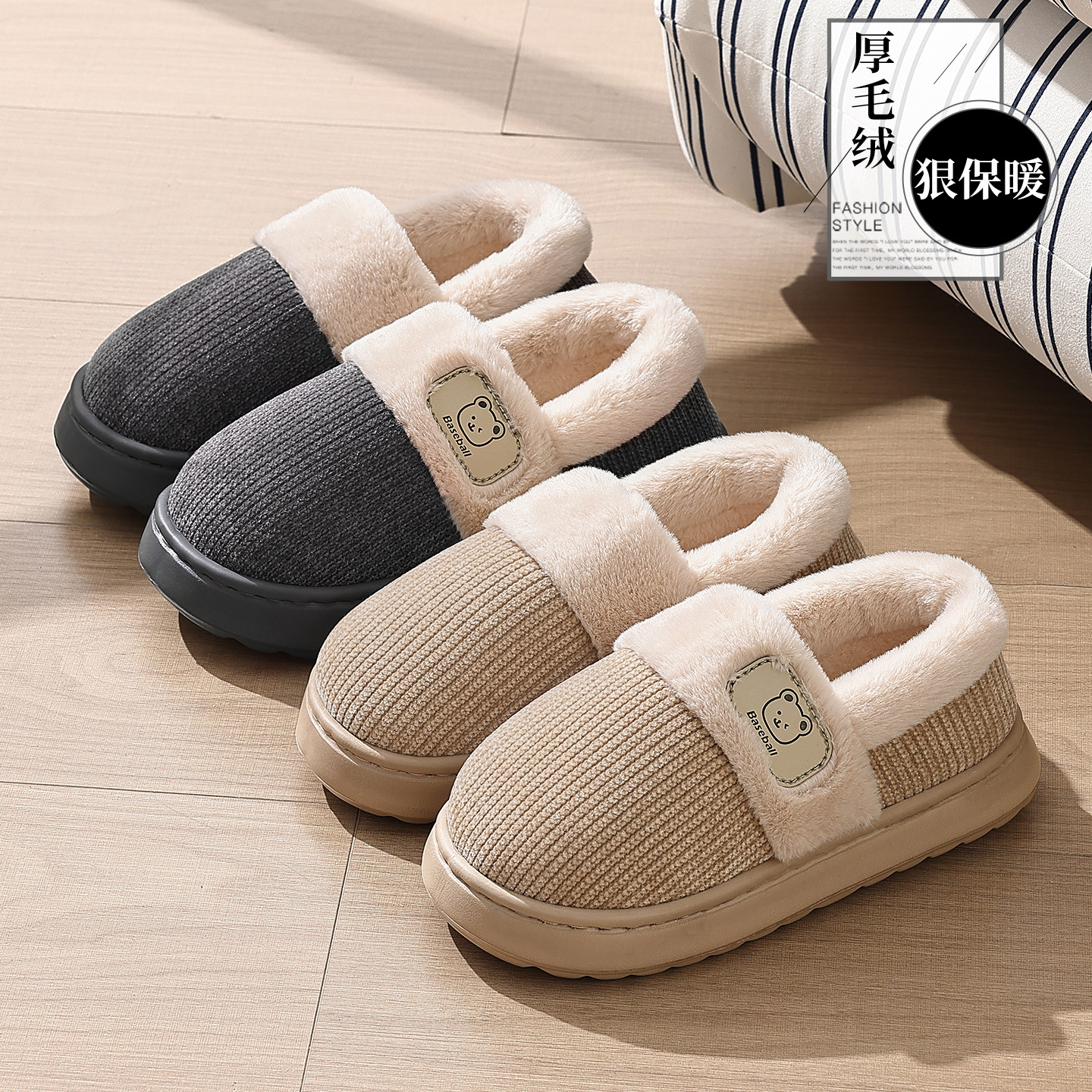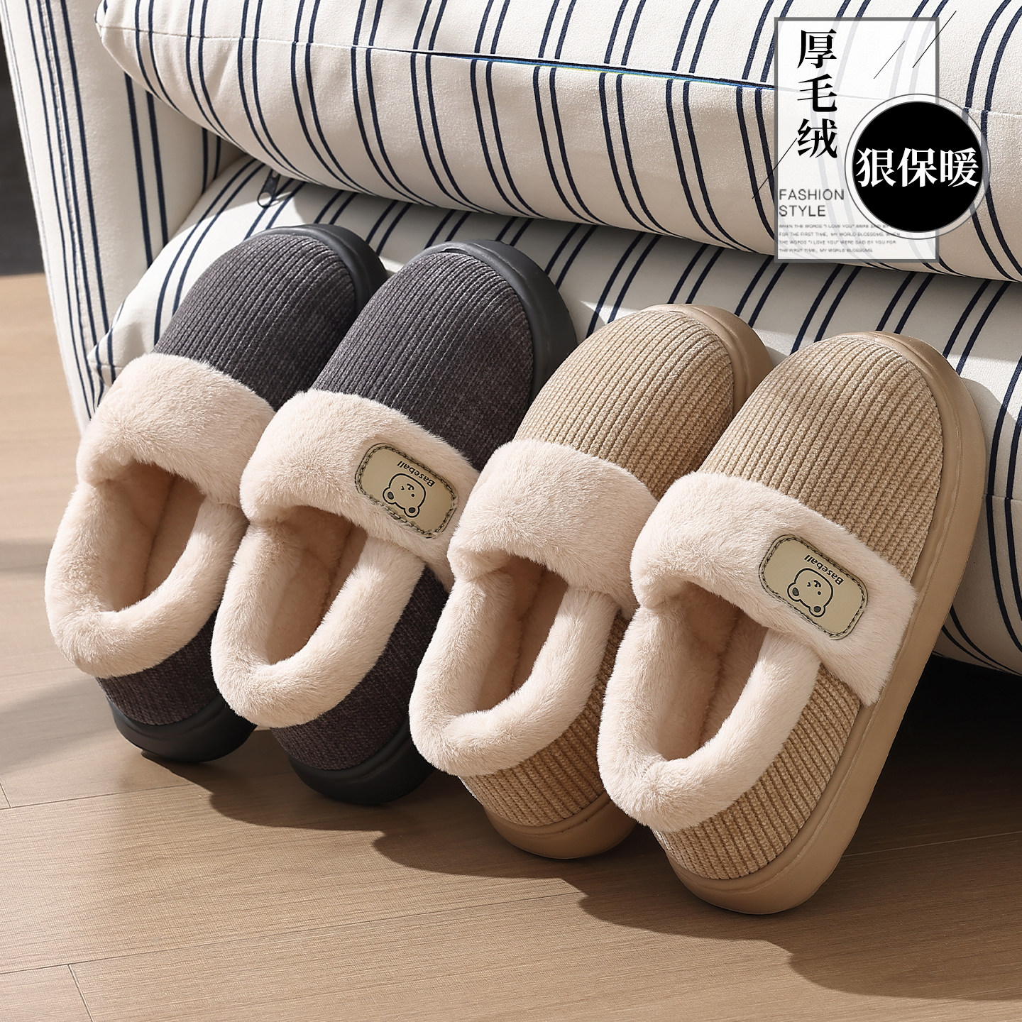 朴西棉拖鞋女士秋冬季厚底简约保暖室内居家用软底防滑情侣棉拖男