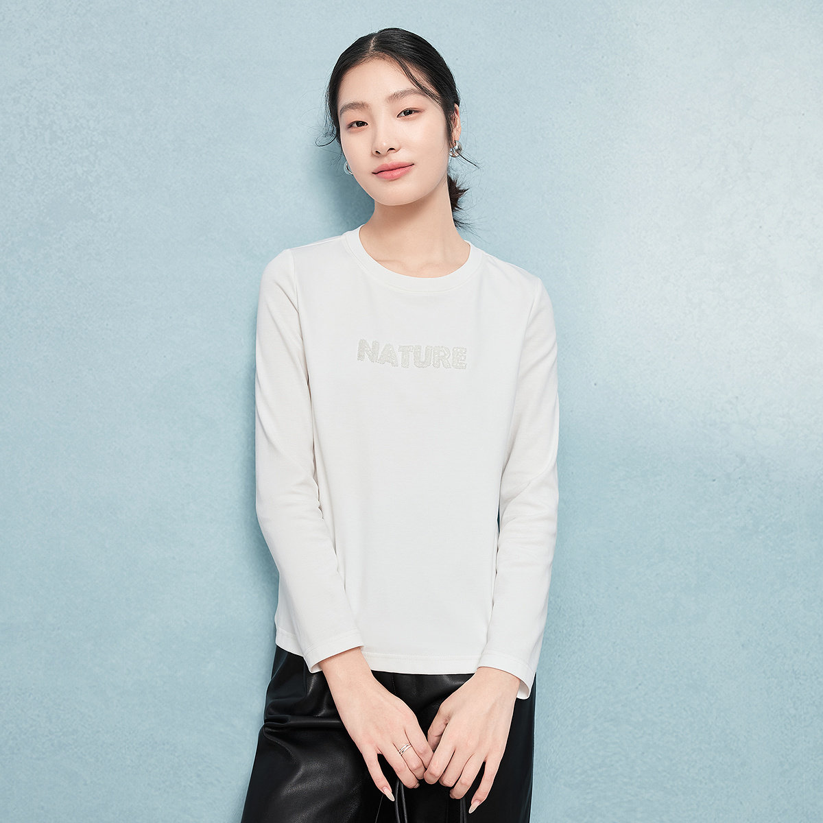三福长袖上衣女2025新款秋冬季圆领内搭打底衫修身白色t恤女装