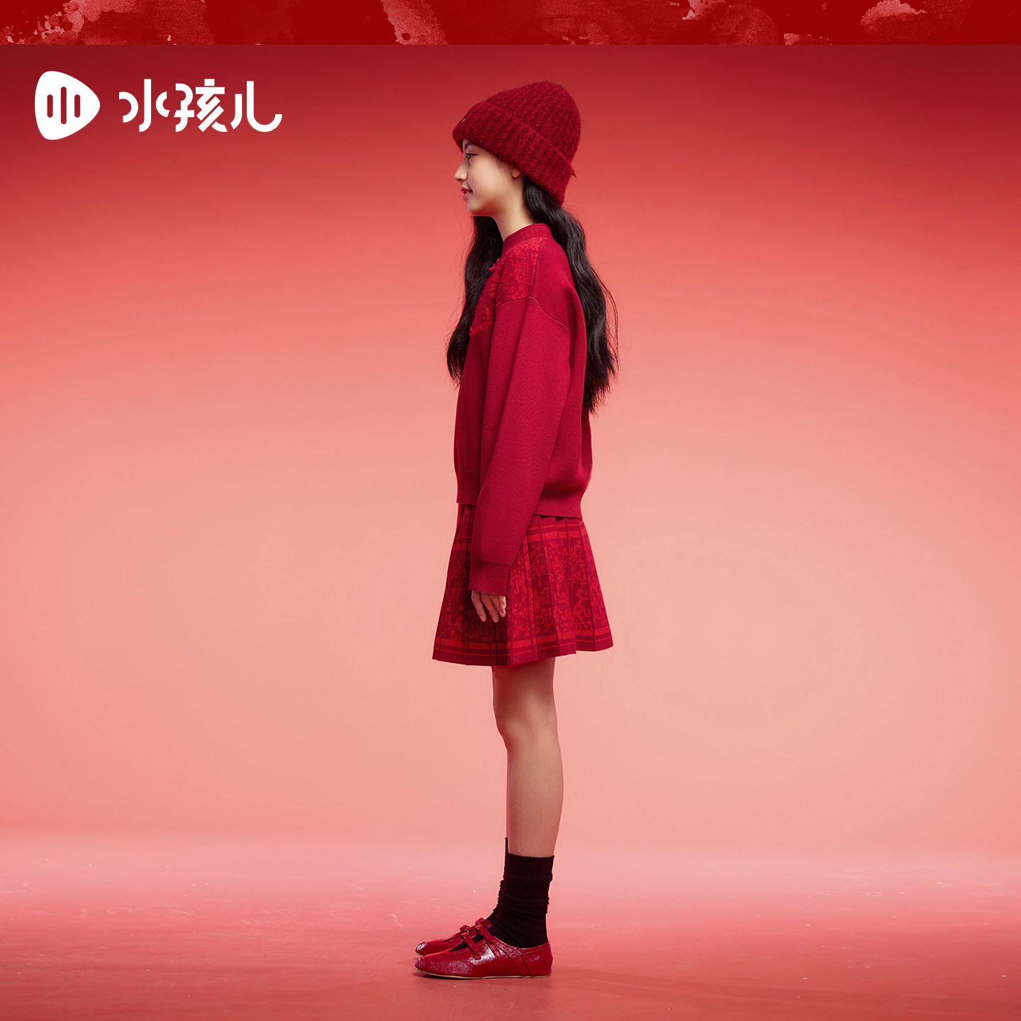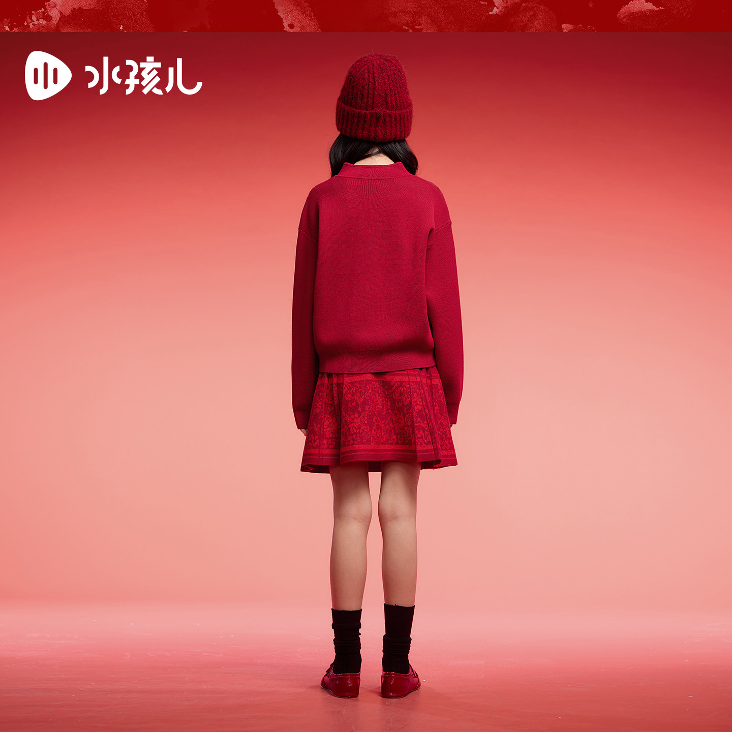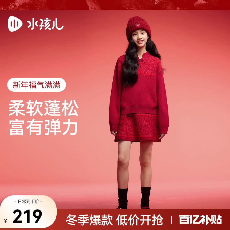 水孩儿女童套装2026春装新品新年红色毛衣半身裙大童针织两件套