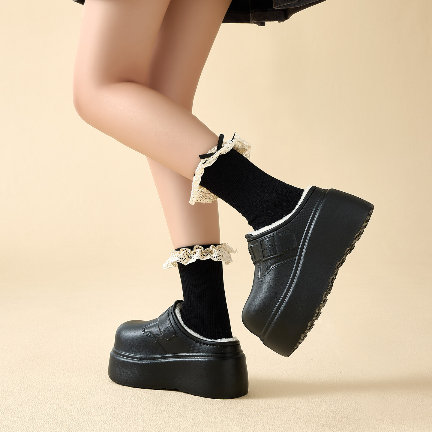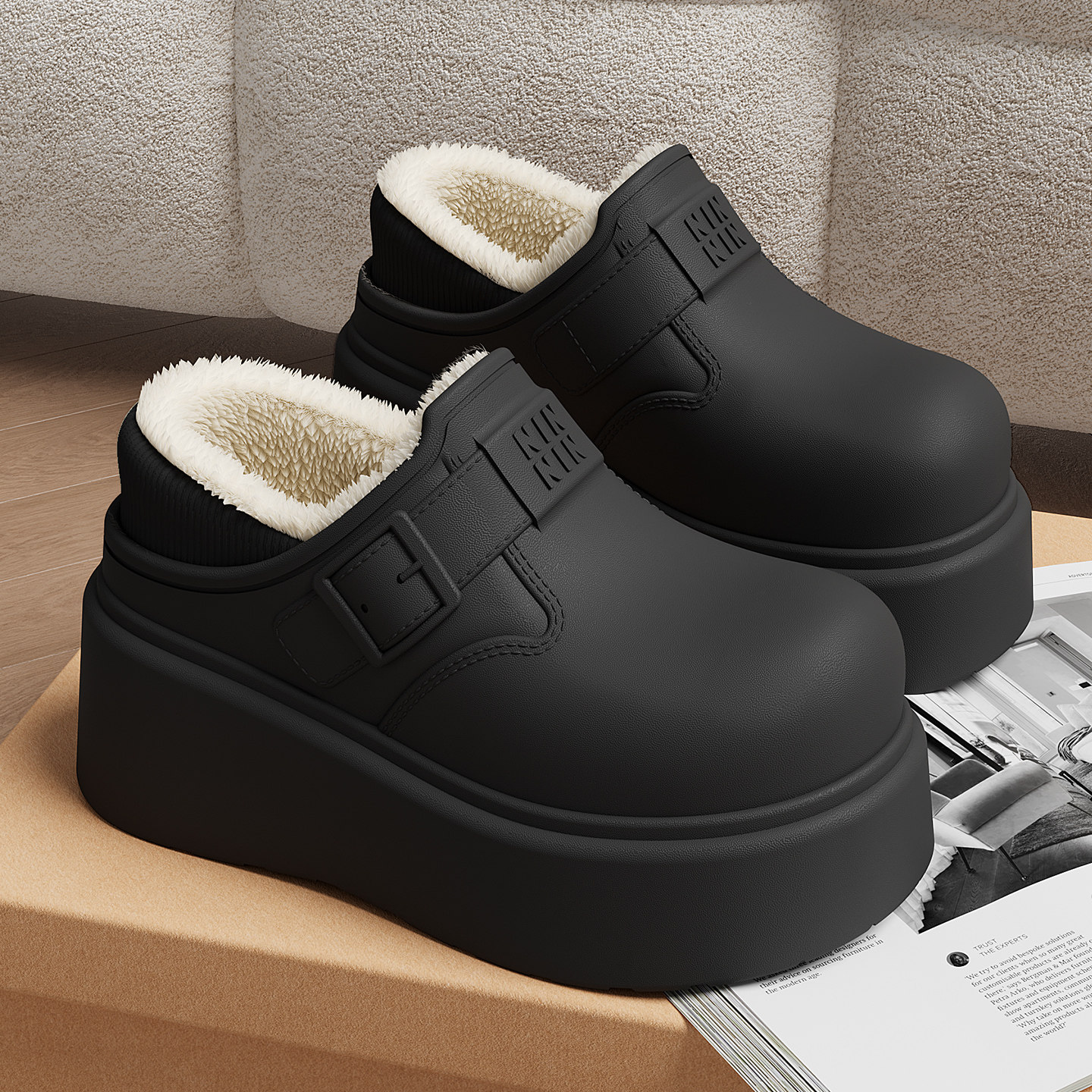 叁叔家~内增高勃肯鞋女加绒秋冬保暖毛毛半拖外穿厚底博肯鞋
