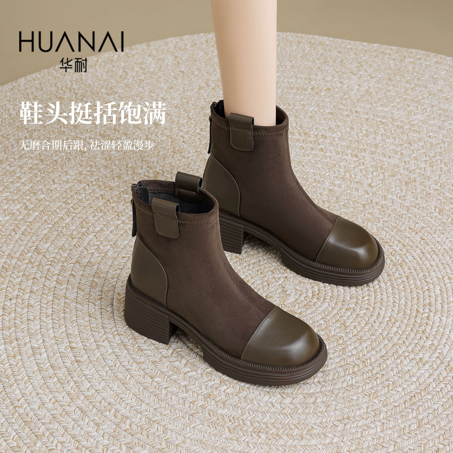 华耐粗跟加绒短靴女2025秋冬新款百搭英伦风马丁靴增高瘦瘦靴单靴
