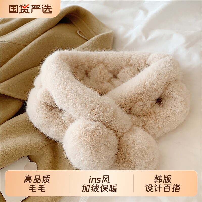毛毛围巾冬季仿皮草交叉球球围脖仿獭兔毛ins保暖毛领灰色粉色