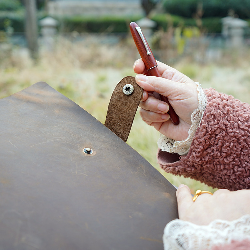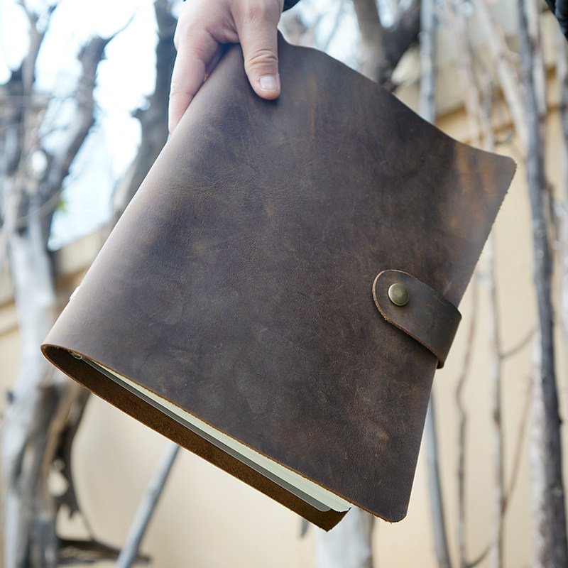手工加大复古头层牛皮素描本26孔B5疯马皮真皮带纽扣可定制笔记本