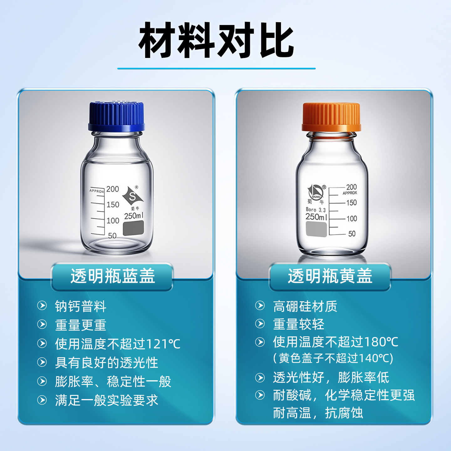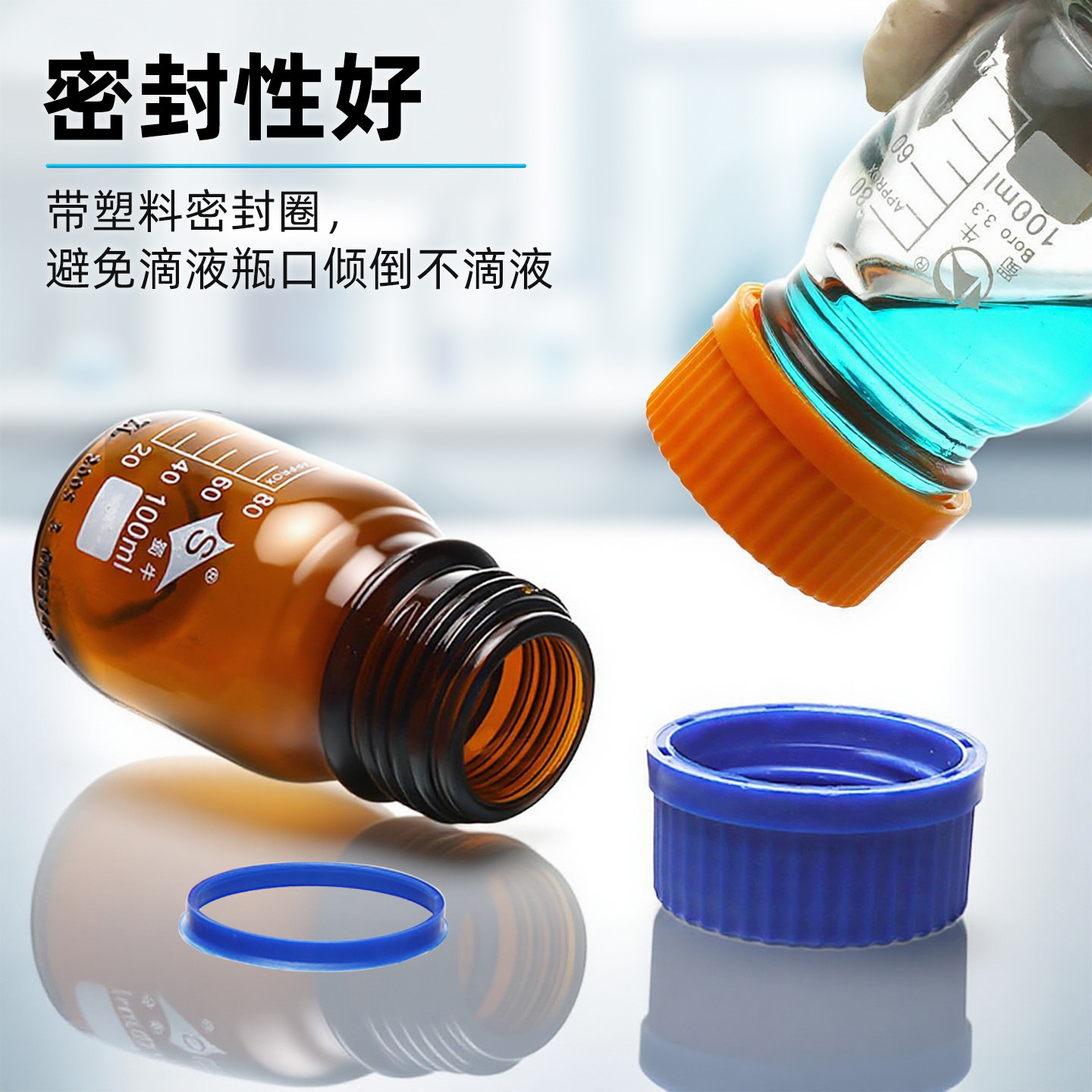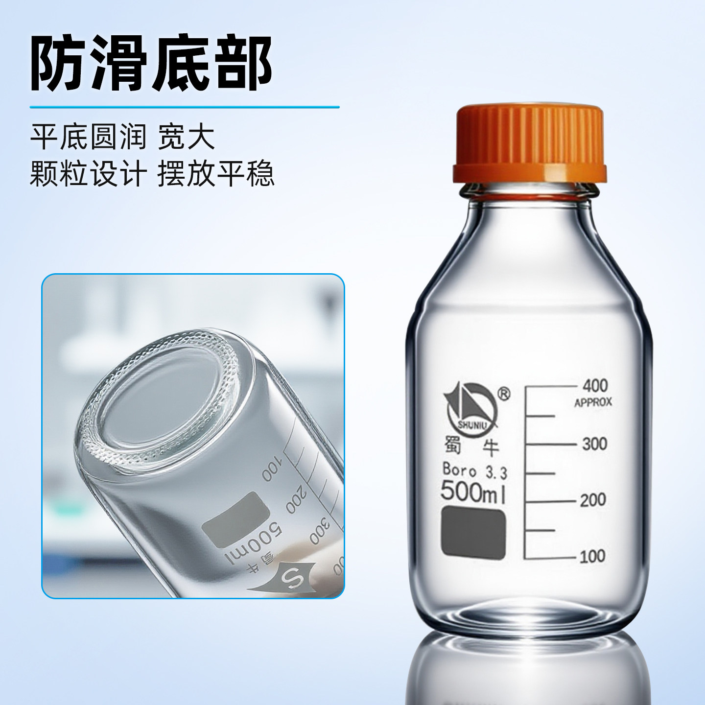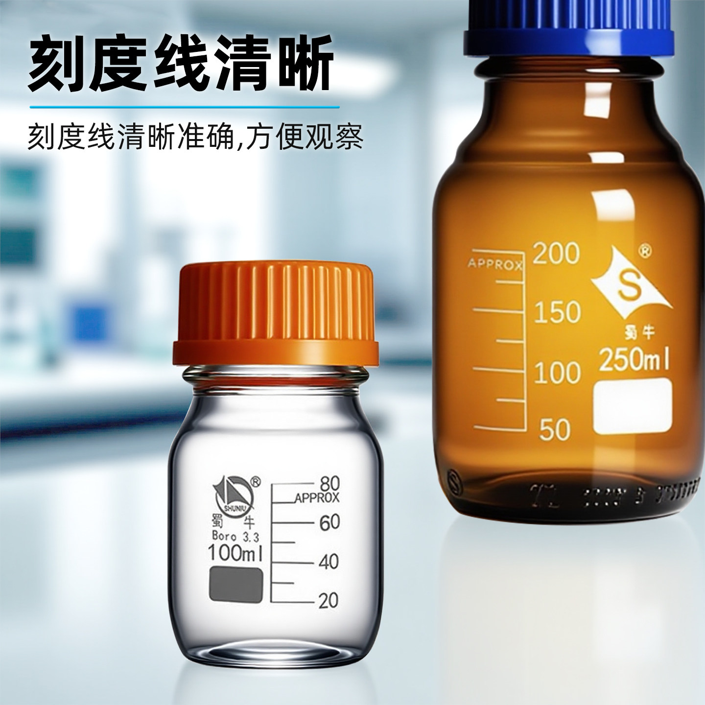蜀牛玻璃蓝盖/橙盖试剂瓶 透明棕色250ml 500ml 螺纹口丝口瓶 化学实验室用广口试剂瓶带刻度取样瓶密封瓶