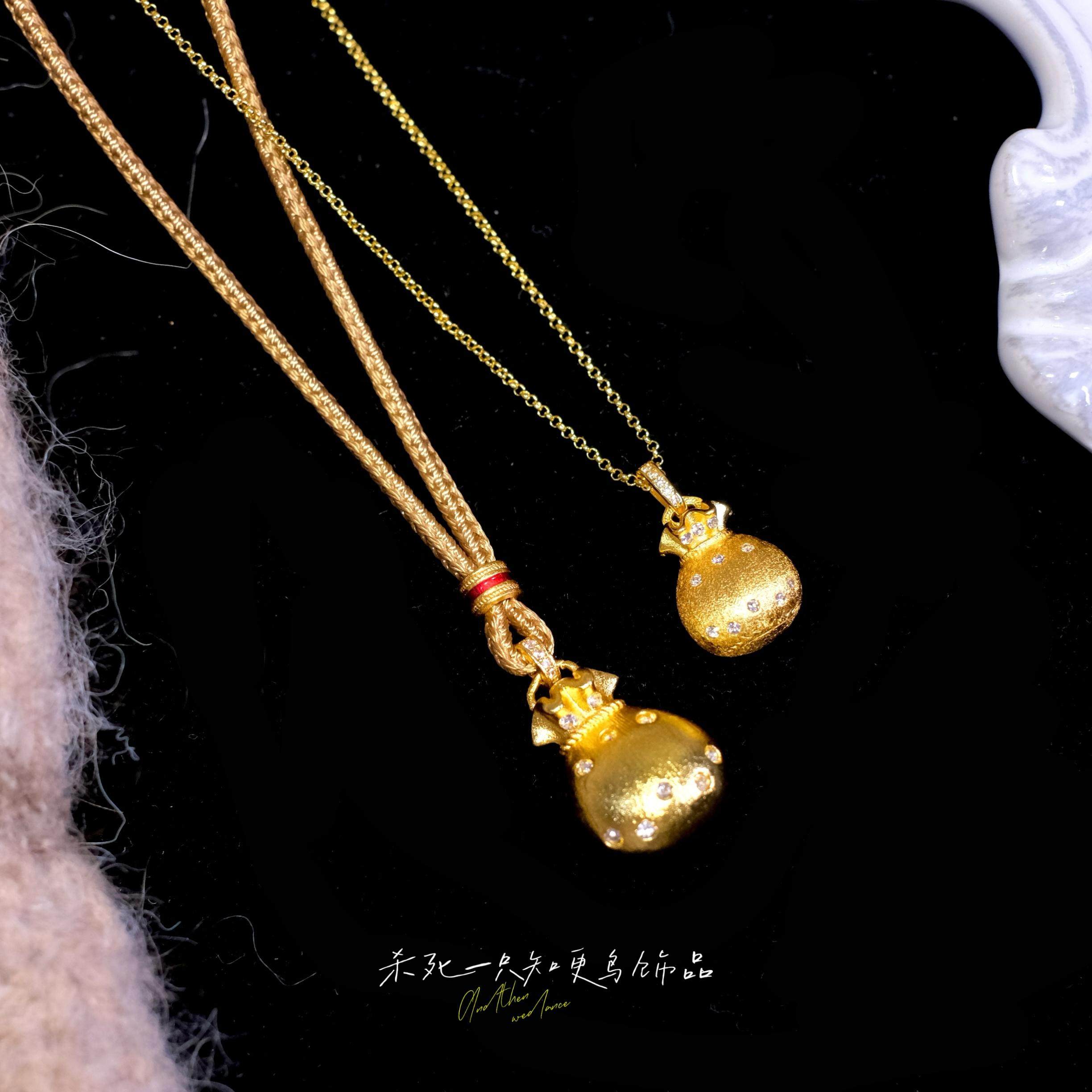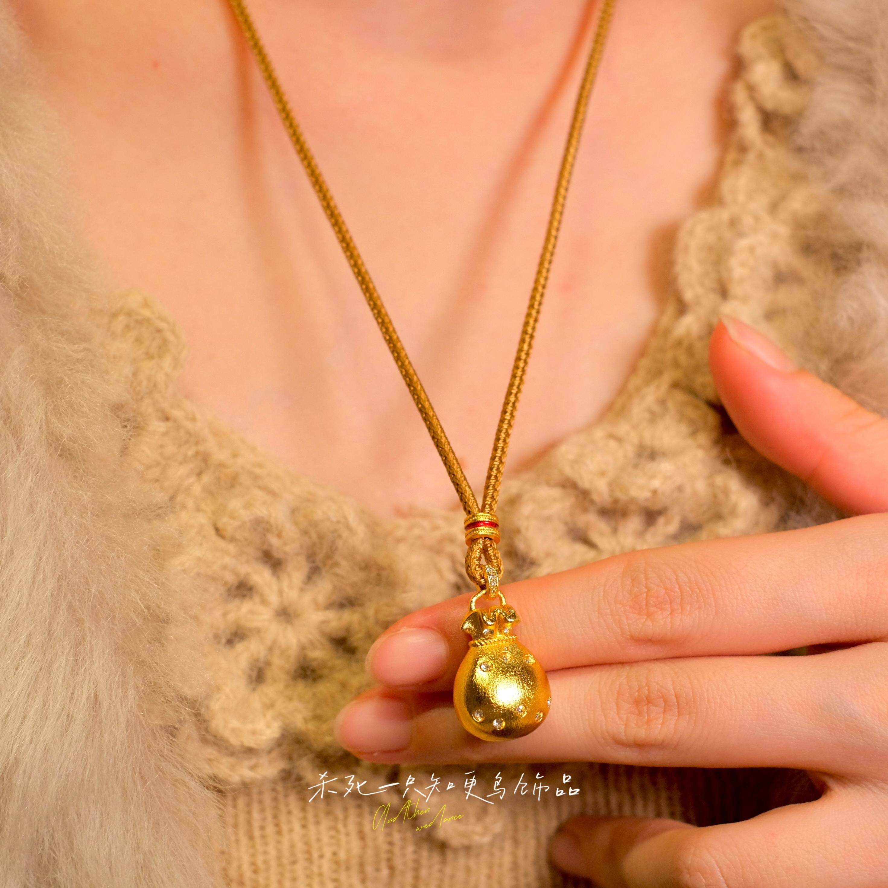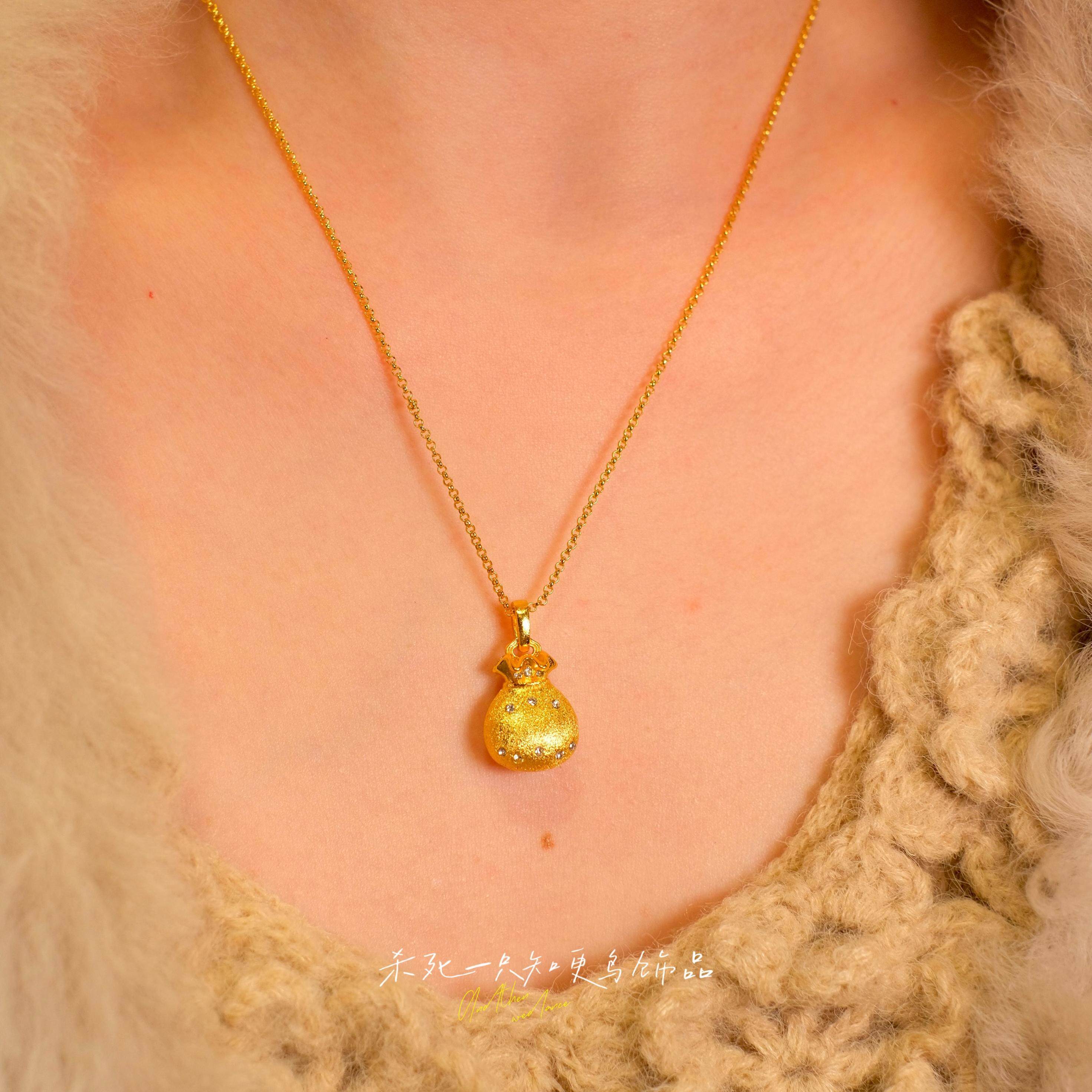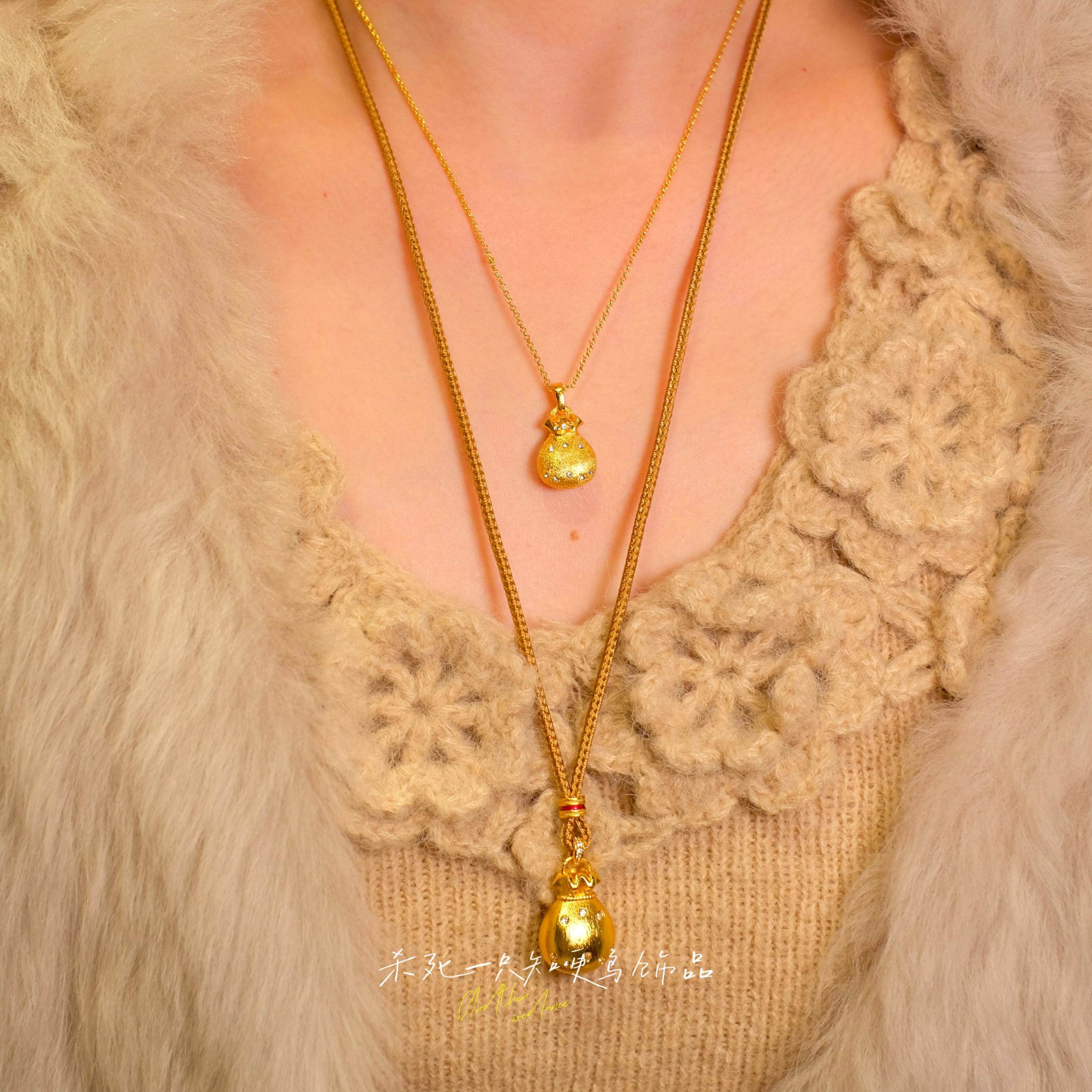 《小钱袋》新中式金店同款古法沙金镶钻毛衣链拉丝福袋锁骨项链