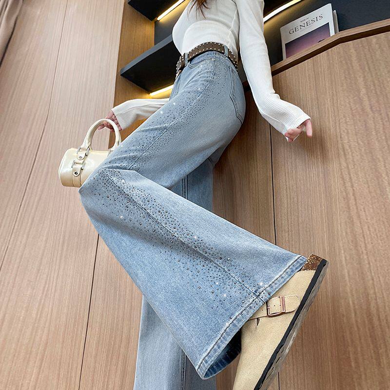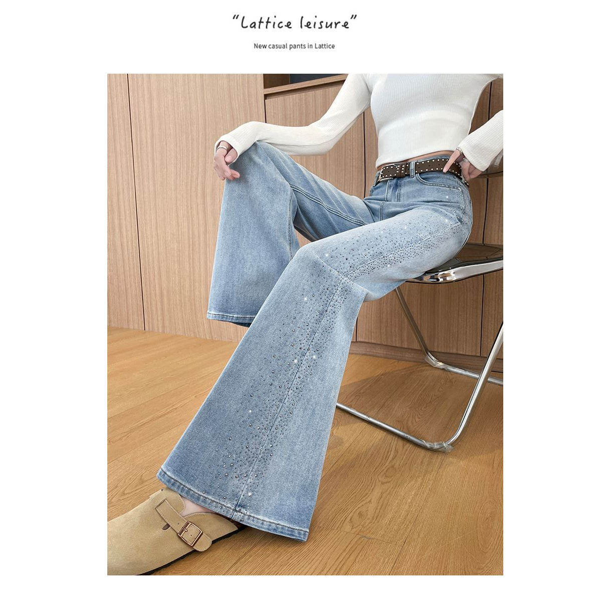 浅蓝色侧满天星微喇牛仔裤女2026春季高腰显瘦设计感烫钻喇叭裤子