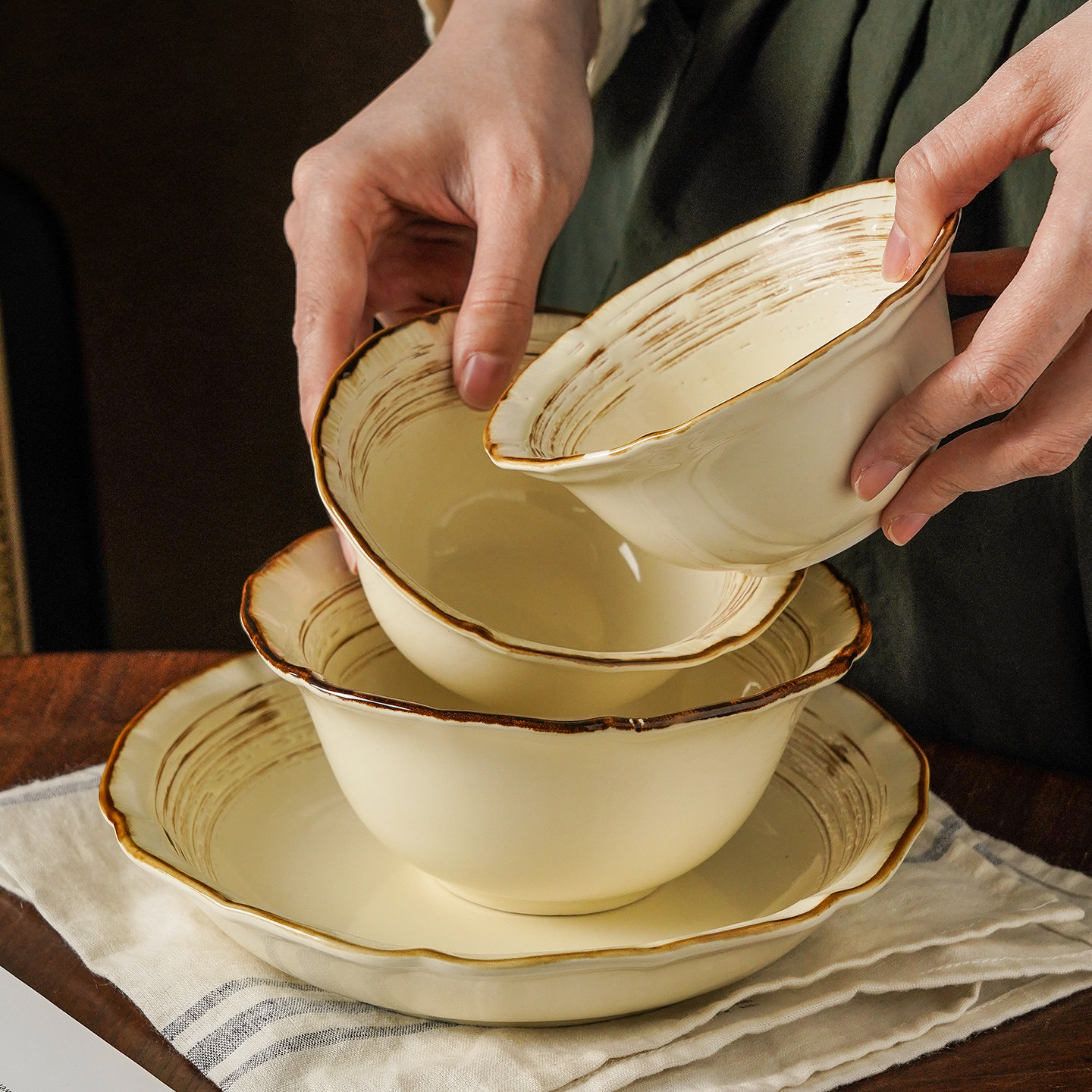 奶油风陶瓷碗家用卡通菜盘子可爱米饭碗汤碗釉下彩儿童餐具耐高温