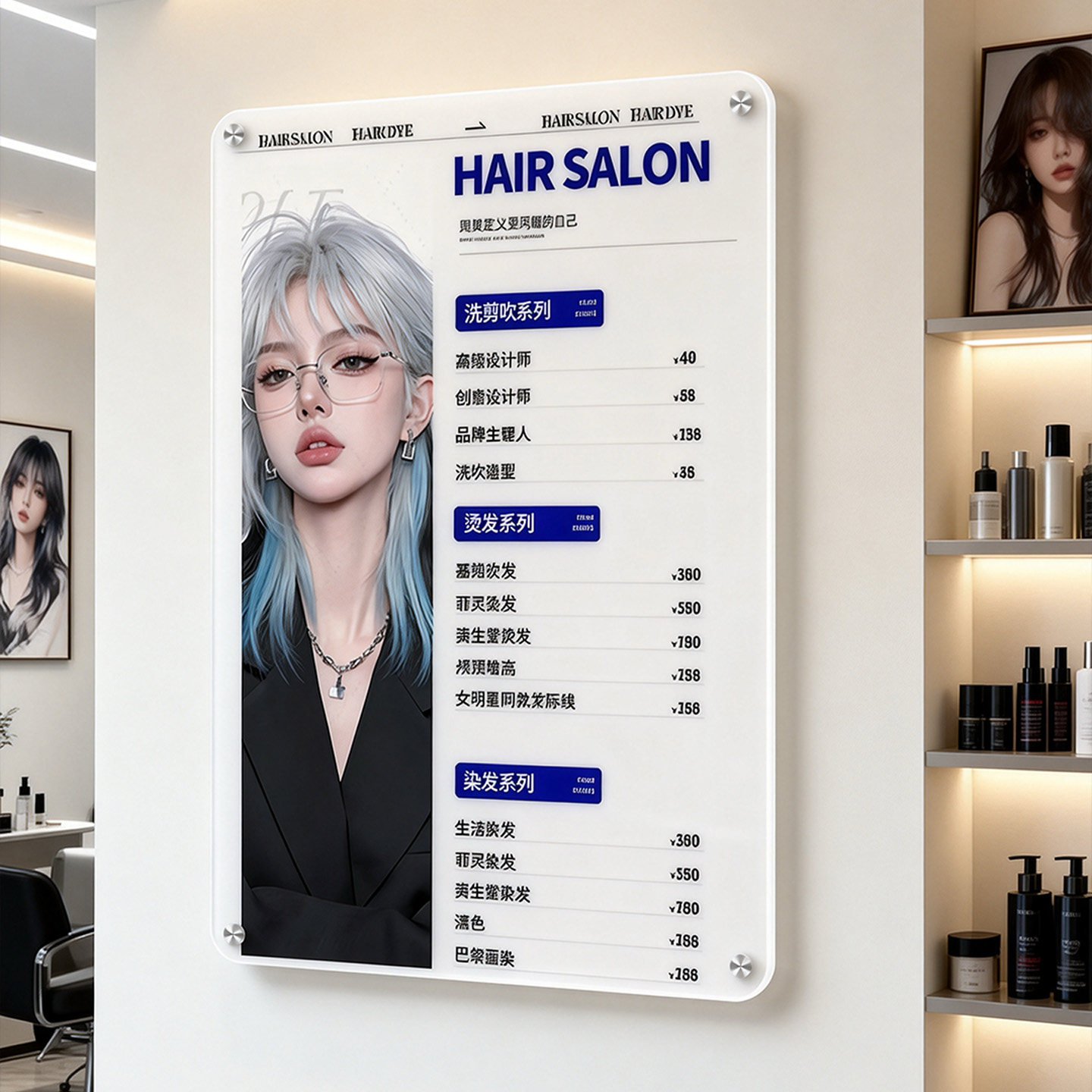 美业美发店价目表美容院发廊标价广告牌展示牌设计亚克力理发店价格表定制美甲养生桌球价位表墙贴提示牌订做