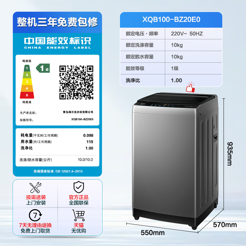 [大神童]海尔波轮洗衣机直驱变频10公斤容量全自动家用宿舍BZ20E0