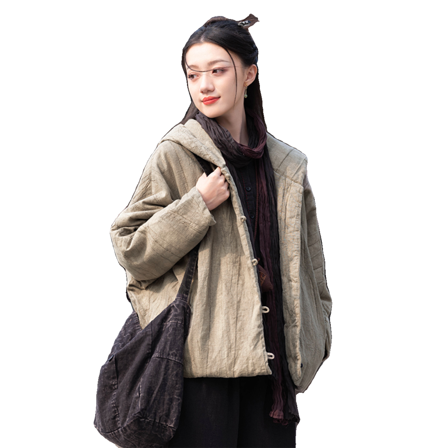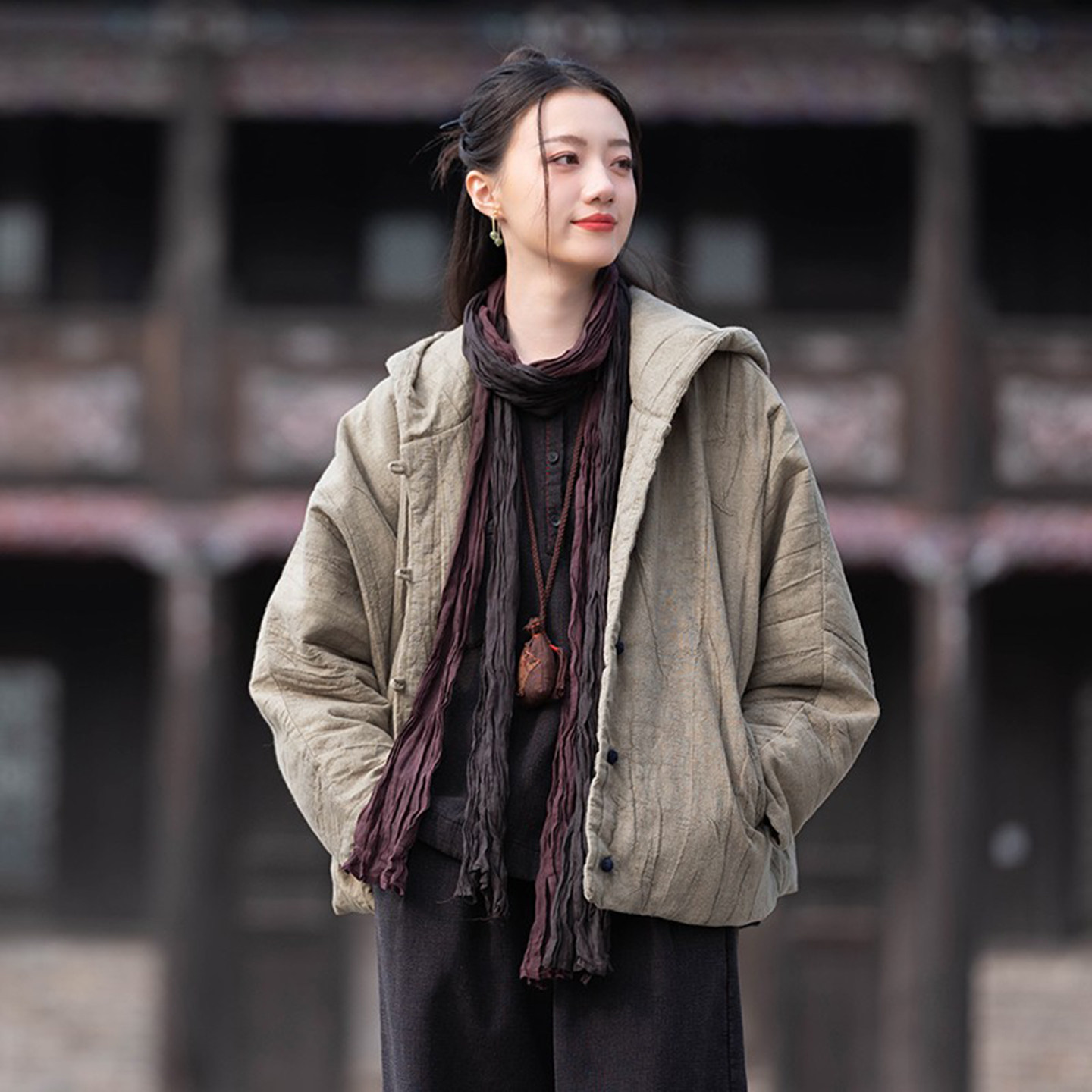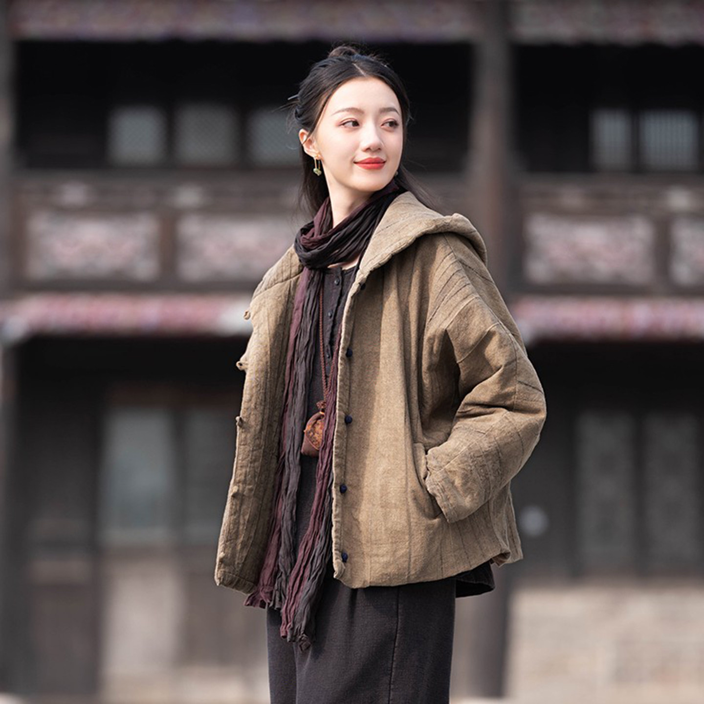 棉麻夹棉外套女冬扎染做旧短款连帽国风棉袄中式复古盘扣加厚棉衣