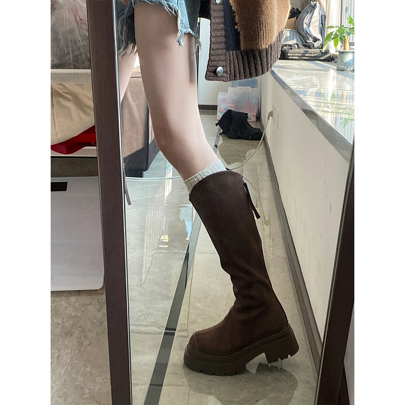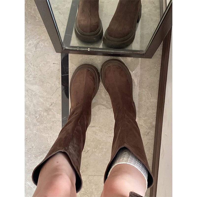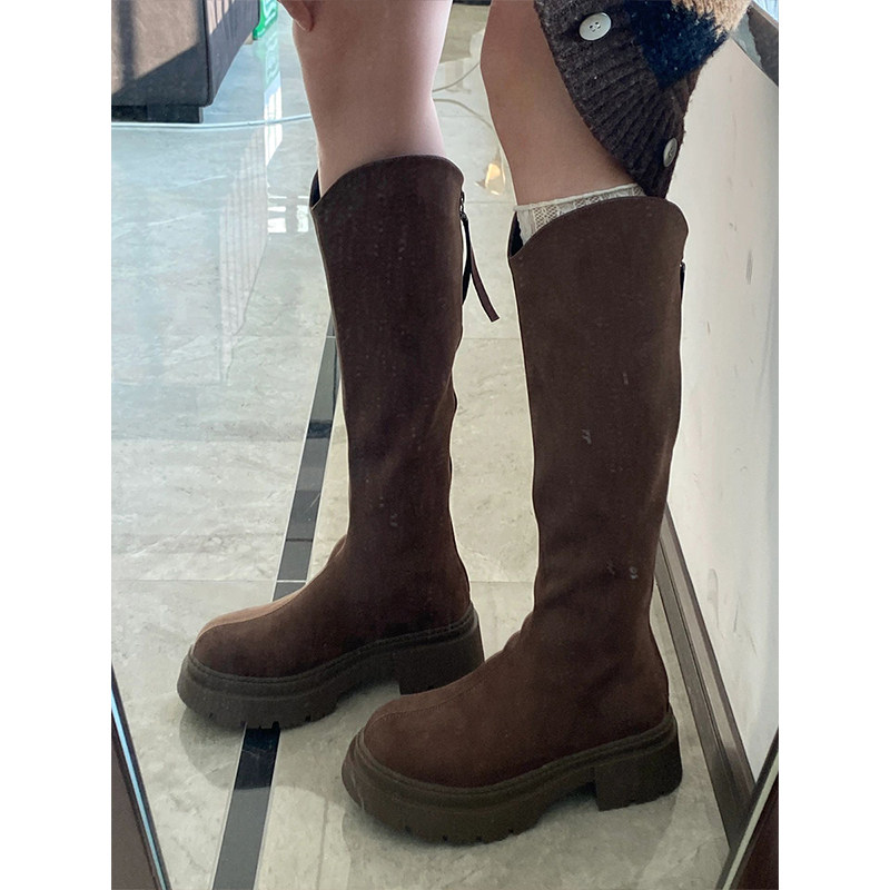美拉德~骑士靴女2025年新款厚底增高v口不过膝棕色长筒靴黑色圆头