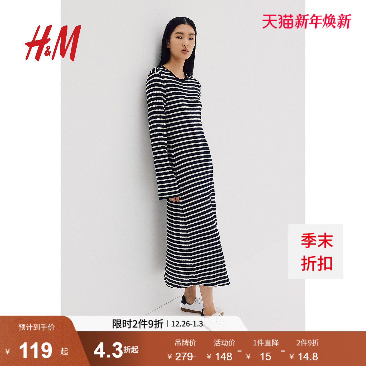 HM女装连衣裙冬季修身休闲条纹圆领长袖中长裙1240140