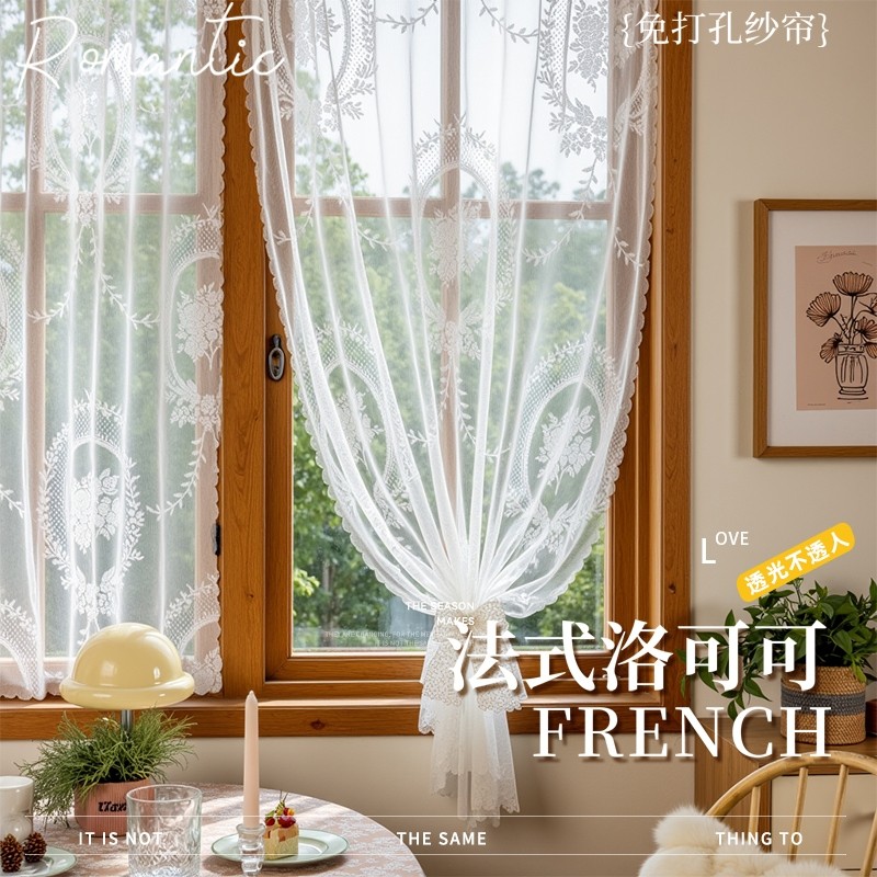 法式蕾丝窗帘柜帘免打孔魔术贴纱帘门帘透光不透人防晒帘遮光飘窗