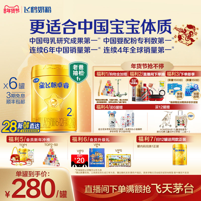 飞鹤卓睿2段乳铁蛋白婴幼儿配方奶粉750g*6罐专利HMO升级官方