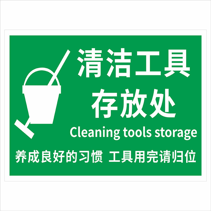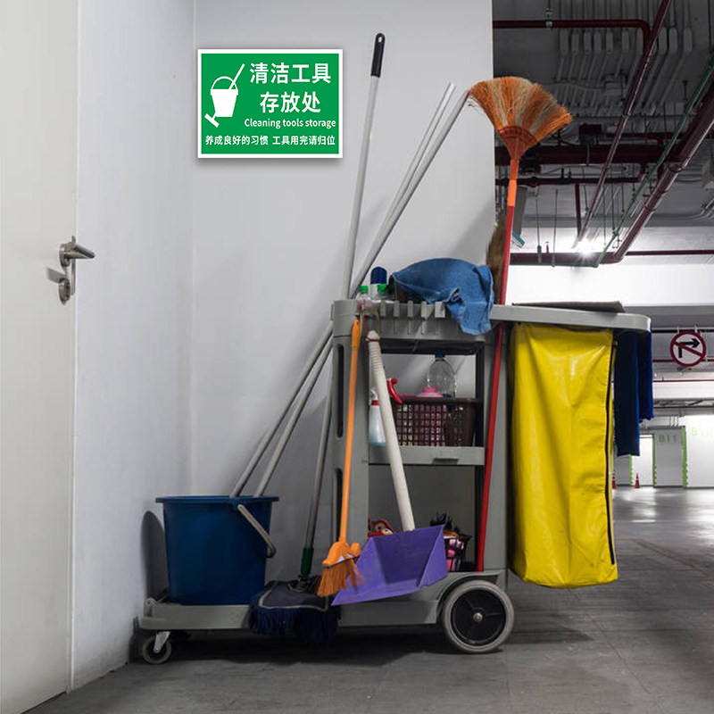 清洁工具用品手推车放置处标识牌垃圾桶饮水机应急物资存放区工具间门牌节约用水小心烫伤用后请归位提示贴纸