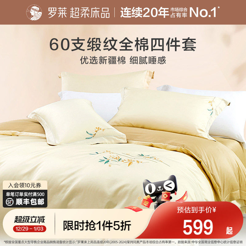 罗莱家纺官方旗舰店新款60支全棉缎纹新疆棉床单被套优雅四件套