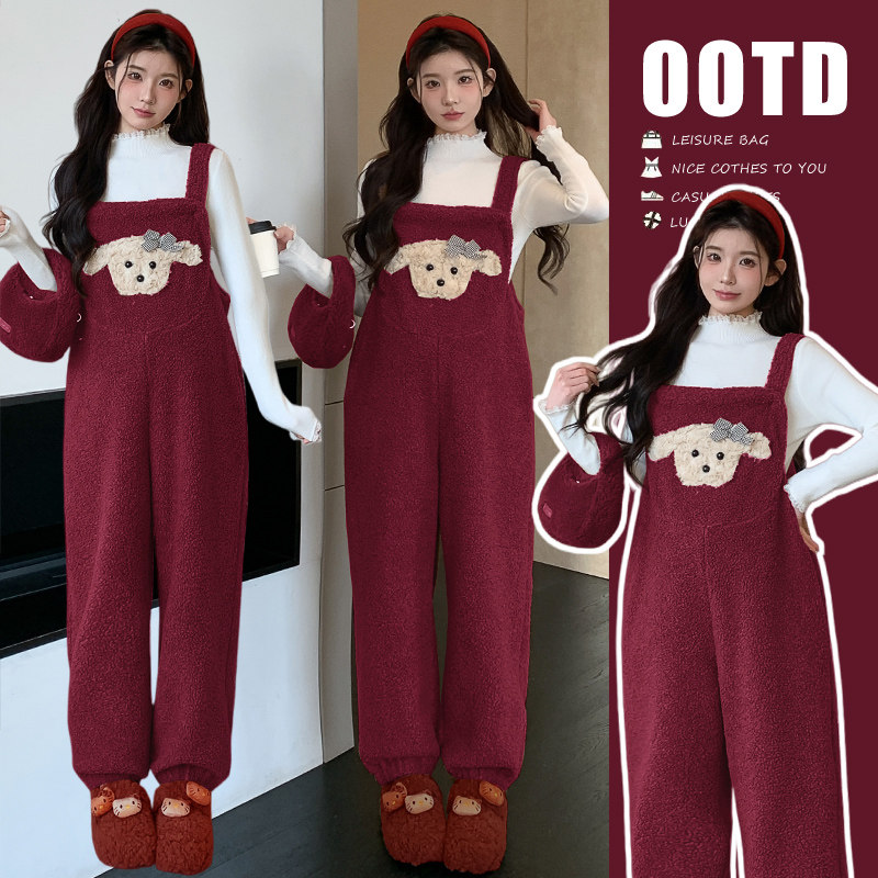 婧麒孕妇装背带裤套装秋冬2025新款加厚羊羔绒两件套宽松两件套女