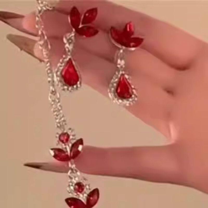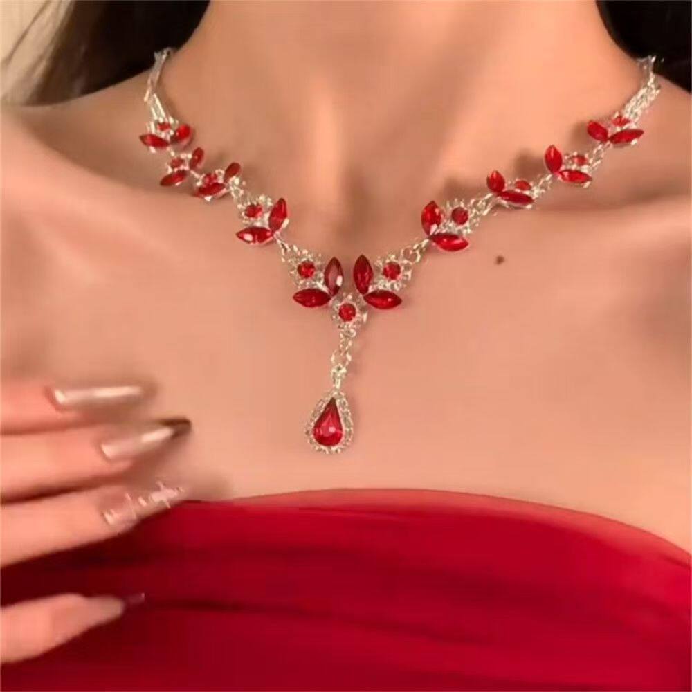 红色花朵水滴流苏锁骨链耳钉套装新娘晚礼服配饰轻奢高级感项链潮