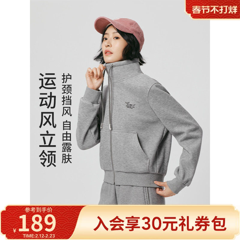 热风女士加绒卫衣2025年冬季新款经典简约运动风立领加厚开衫外套