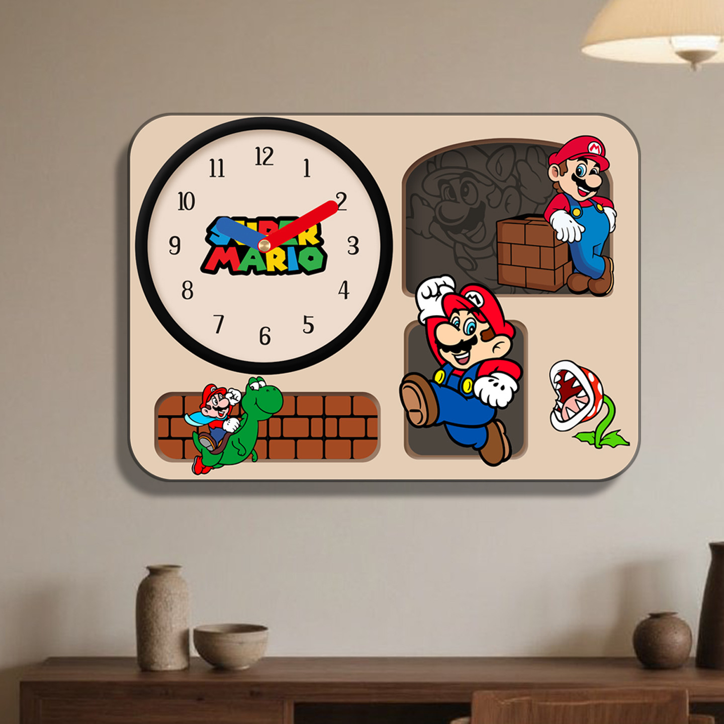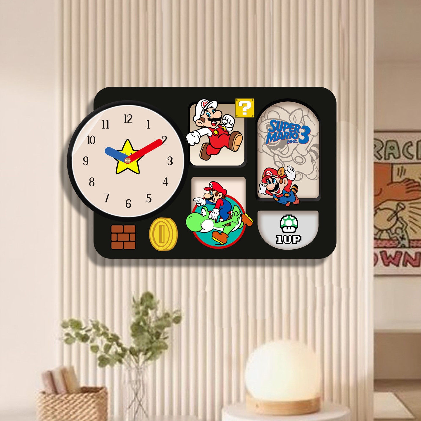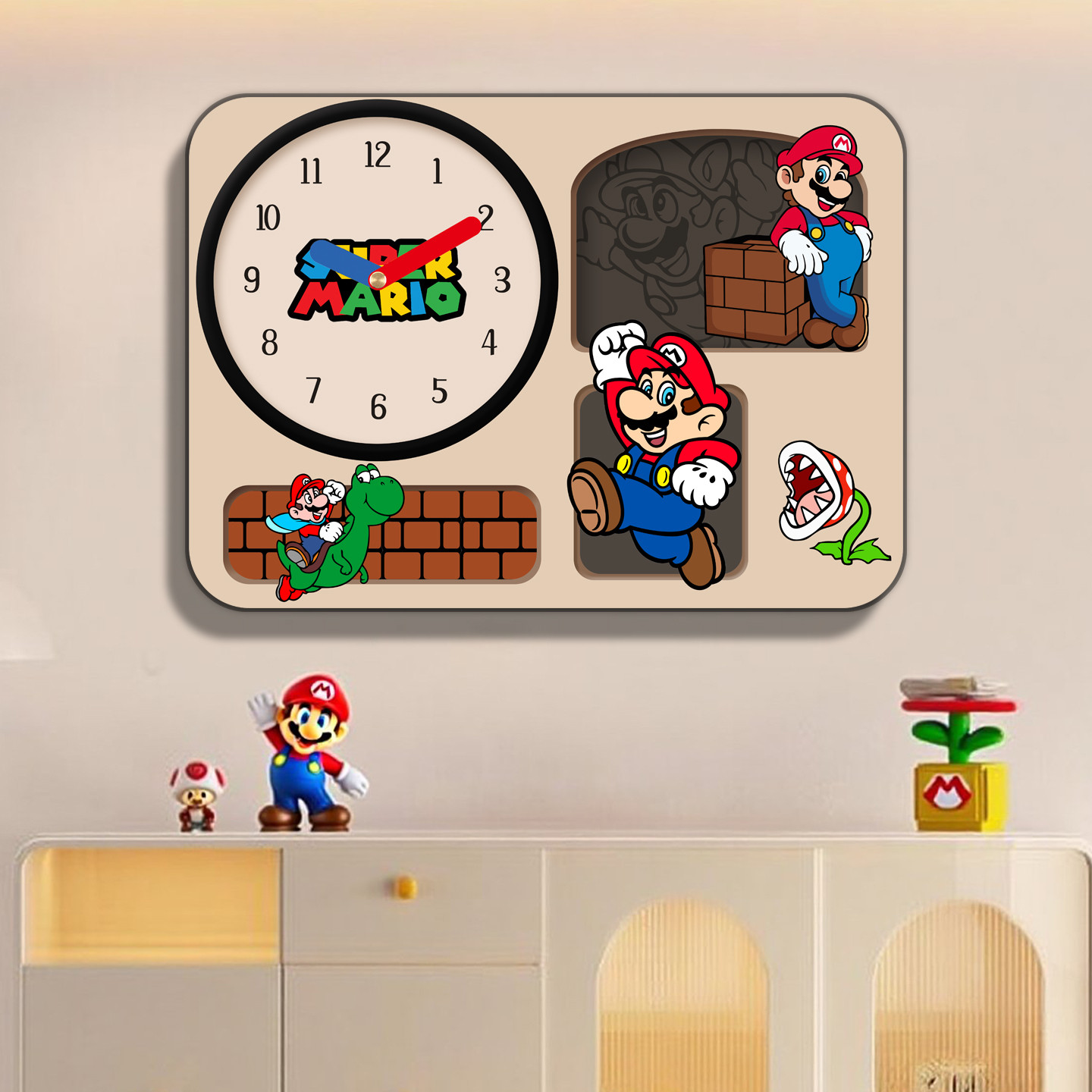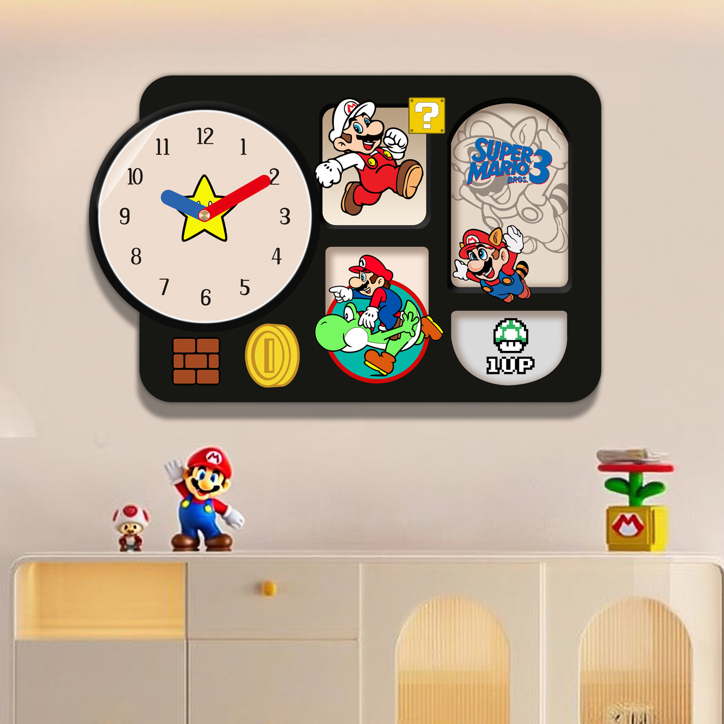 马里奥客厅挂钟餐厅时钟新款儿童卡通静音时钟带钟罩玻璃装饰画钟