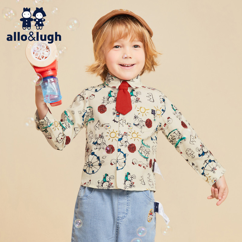 【学院风】阿路和如男童满印长袖衬衫2025年秋冬涂鸦萌趣领结上衣