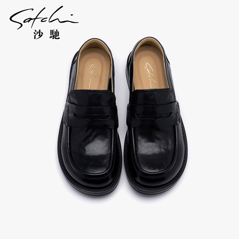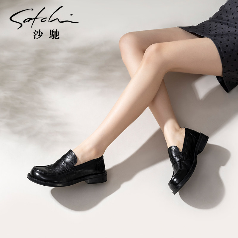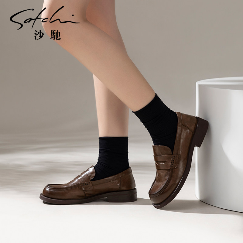 沙驰女鞋复古小皮鞋单鞋26春季新款一脚蹬乐福鞋女真皮软底不累脚