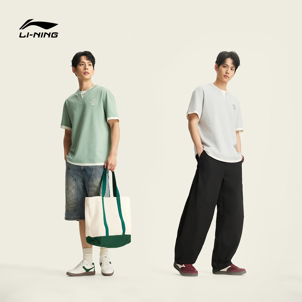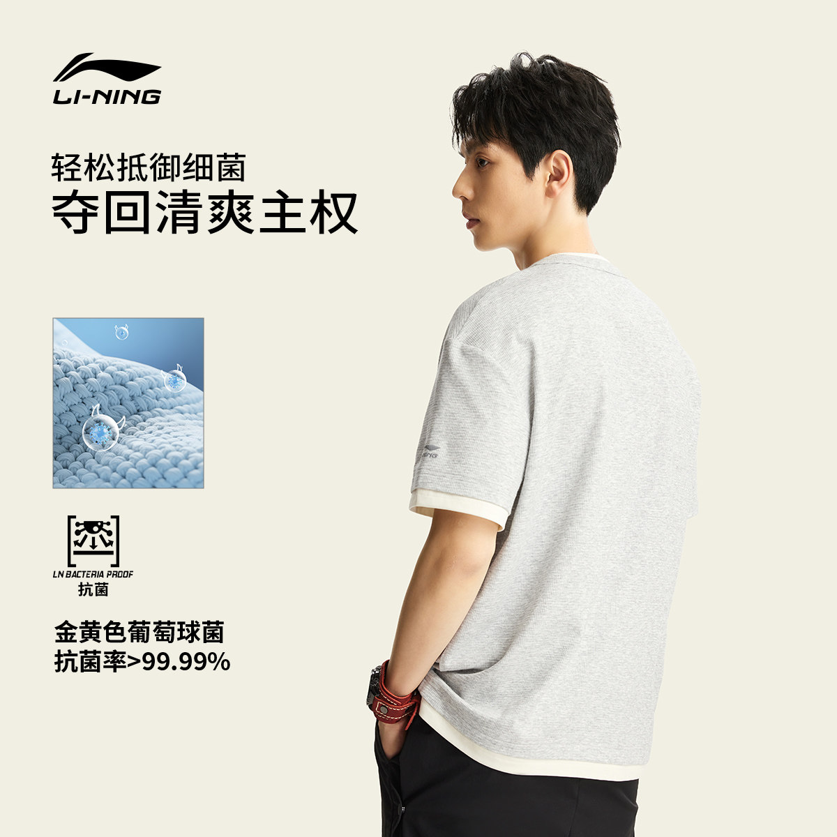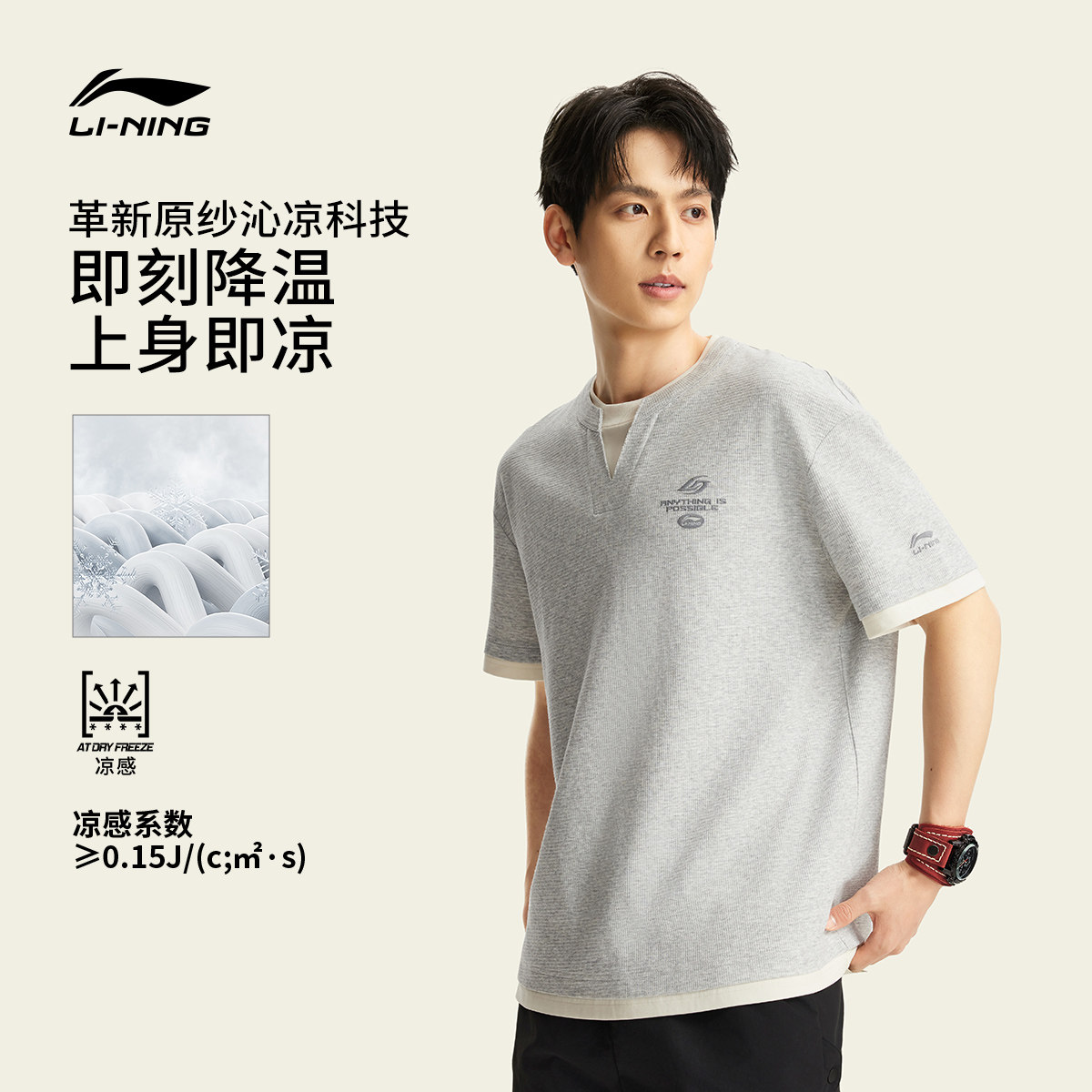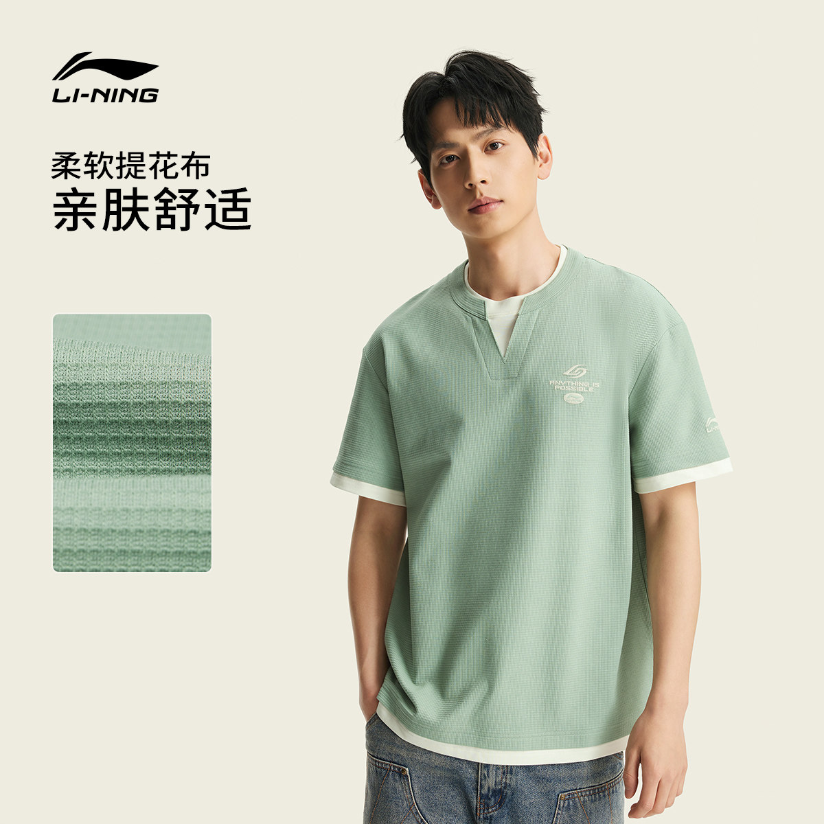 李宁冰丝短袖男士春夏2026新款男装假两件上衣刺绣V领半袖运动T恤