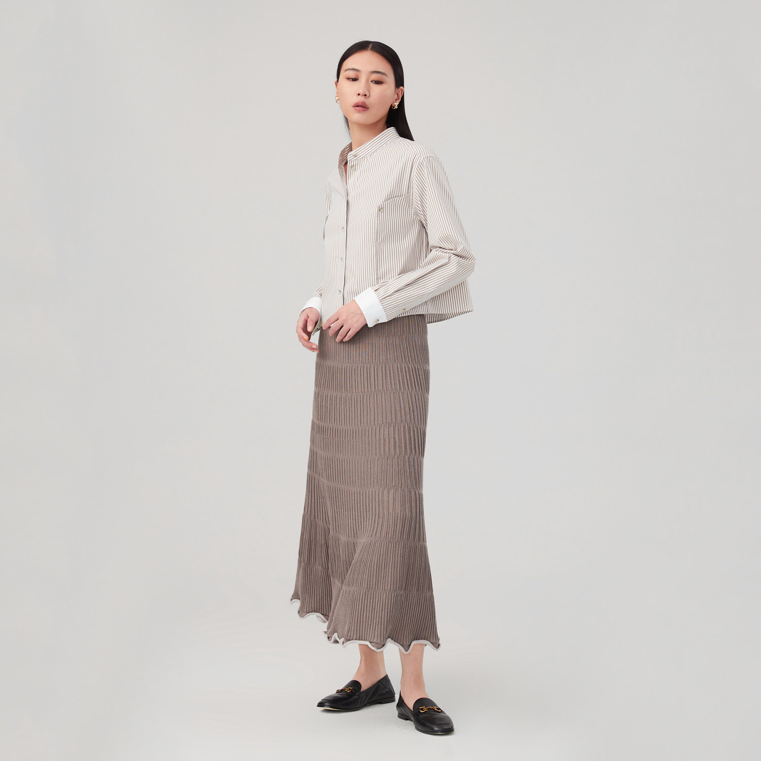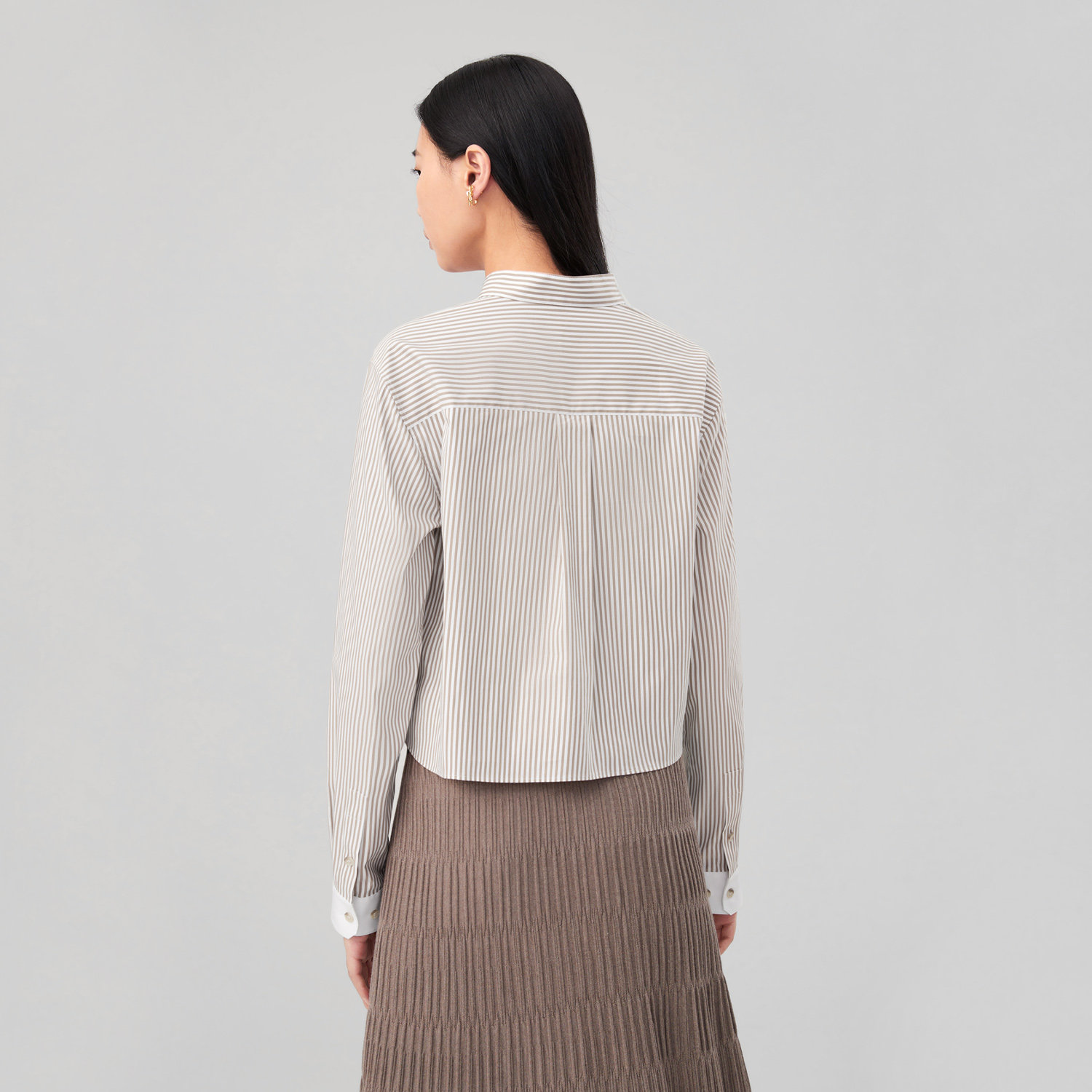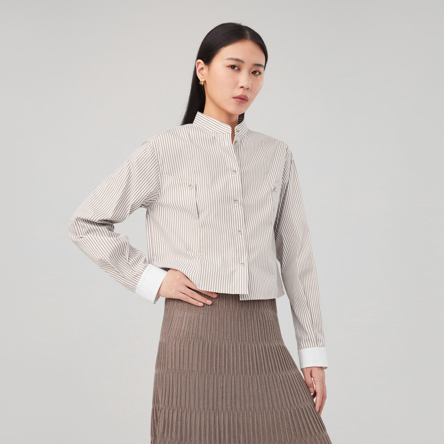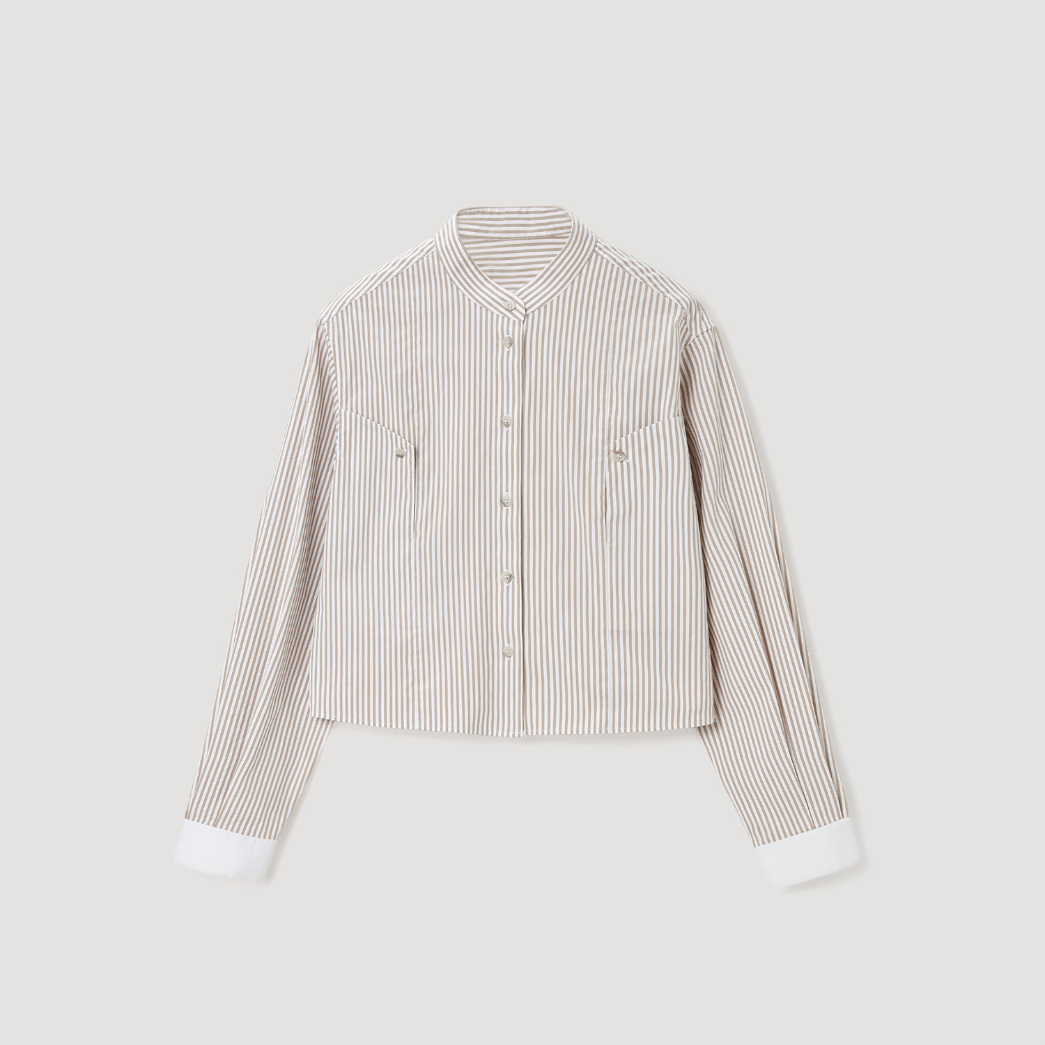 OVVOutlet秋冬新款女装海军风条纹立领撞色袖口棉感长袖衬衫